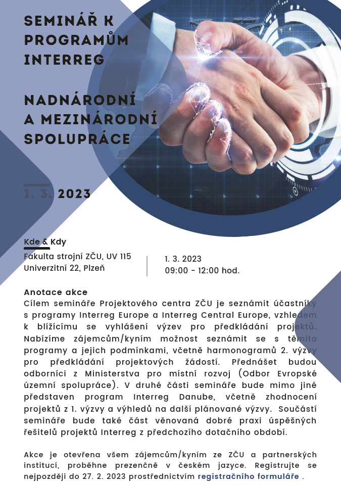 Součástí semináře bude také část věnovaná dobré praxi úspěšných řešitelů projektů Interreg z předchozího dotačního období, např. k projektu s názvem Cerdee, kde Západočeská univerzita v Plzni vystupovala v roli partnera.