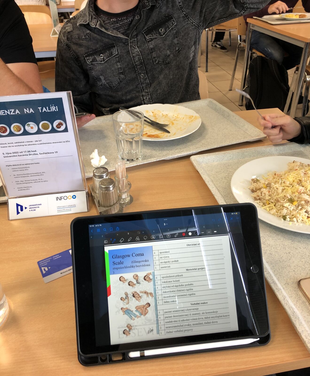 V kavárně Fakulty aplikovaných věd má Libor Víta sraz se sestrou, která ho doučuje počítání příkladů ze Statistického zpracování dat. Daniel Duda od 12:05 vyučuje předmět Tekutiny a teplo. „Dnes na programu první věta termodynamická a odvození Mayerových vztahů pro ideální plyn, vztahu pv^κ=konst. a ukázka Maxwelových vztahů mezi parciálními derivacemi jednotlivých TD veličin,“ pokouší se ho přiblížit.