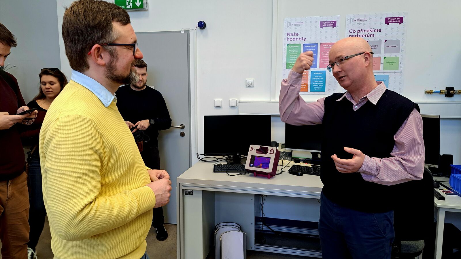 Po návštěvě laboratoří následovala ještě neformální diskuze o problémech výzkumných ústavů. „Debatovali jsme o důležitosti internacionalizace, o těžkostech při zaměstnávání zahraničních výzkumníků a agendě spojené s odvody sociální a zdravotního pojištění při souběhu zaměstnání, o per diems a mnohém dalším. Diskuze byla opravdu intenzívní, neboť pan Peksa má vhled do problematiky, kterou se zabýváme,“ dodává Petr Kavalíř. Mikuláš Peksa věří, že to rozhodně nebyla jeho poslední návštěva v Plzeňském kraji, a doufá, že příště navštíví i další výzkumná centra.