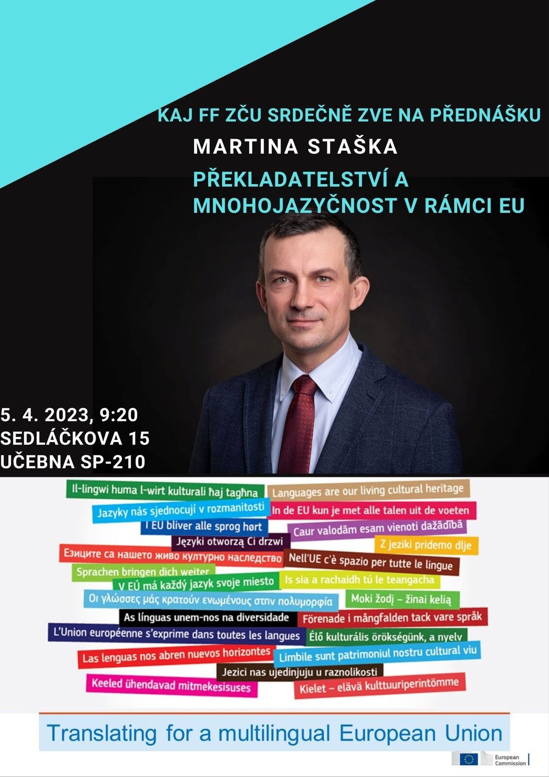 Evropská unie má 24 úředních jazyků, a překladatelství a tlumočnictví proto sehrává na její půdě velmi důležitou roli. Katedra anglického jazyka a literatury zve studentky a studenty, vyučující i širokou veřejnost na přednášku, při níž se o své znalosti a zkušenosti podělí překladatel Martin Stašek, který působí v Bruselu jako člen českého zastoupení při Evropské komisi. Účast na přednášce bezesporu ocení zvlášť ti, kdo se zajímají o překlady a tlumočení a rádi by do této oblasti pronikli více.