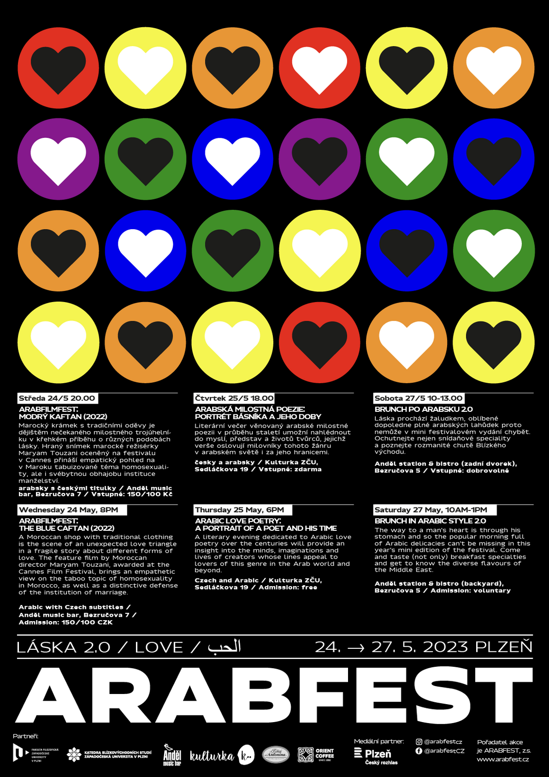 Třináctý ročník Festivalu arabské kultury, tzv. ARABFESTU, se uskuteční od 24. do 27. května v Plzni. Letošní mini vydání festivalu má podtitul Láska 2.0 a navazuje tak na téma z loňského roku. Návštěvníci se mohou těšit na promítání marockého snímku reflektujícího společenská tabu v oblasti manželského života a LGBT tematiky, literární večer zasvěcený milostné poezii napříč staletími a nakonec ochutnávku blízkovýchodních specialit na oblíbené sobotní akci Brunch po arabsku.