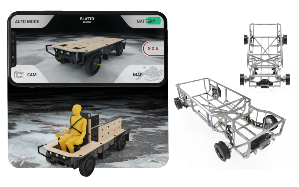 „Blatto má skládací sedačky a hliníkovou konstrukci skrytou pod textilií, která se používá u kabrioletu. Vozidlo je elektrické, ovladatelné dvěma joysticky, a dokonce autonomní – díky kamerám, které jsou v každém rohu, ho můžete ovládat pouze pomocí aplikace v telefonu, například pro svoz balíků a zboží,“ vysvětluje Ondrej Adamec.