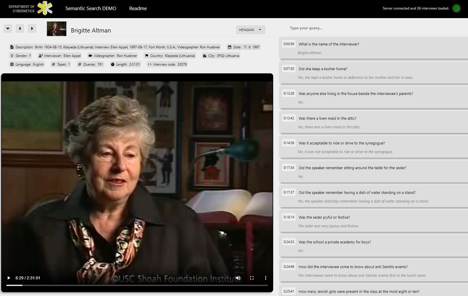 Vyhledávání pomocí položených otázek, tak se jmenuje nová technologie strojového učení vědců z katedry kybernetiky FAV, která umožňuje procházet dlouhé sekvence videozáznamů, a to na základě předem vygenerovaných otázek s časovým určením. Ty uživatele provedou obsahem videa a umožní přímou interakci s ním. Uživatelé tak mohou v archivech ústní historie pracovat intuitivním a interaktivním způsobem.