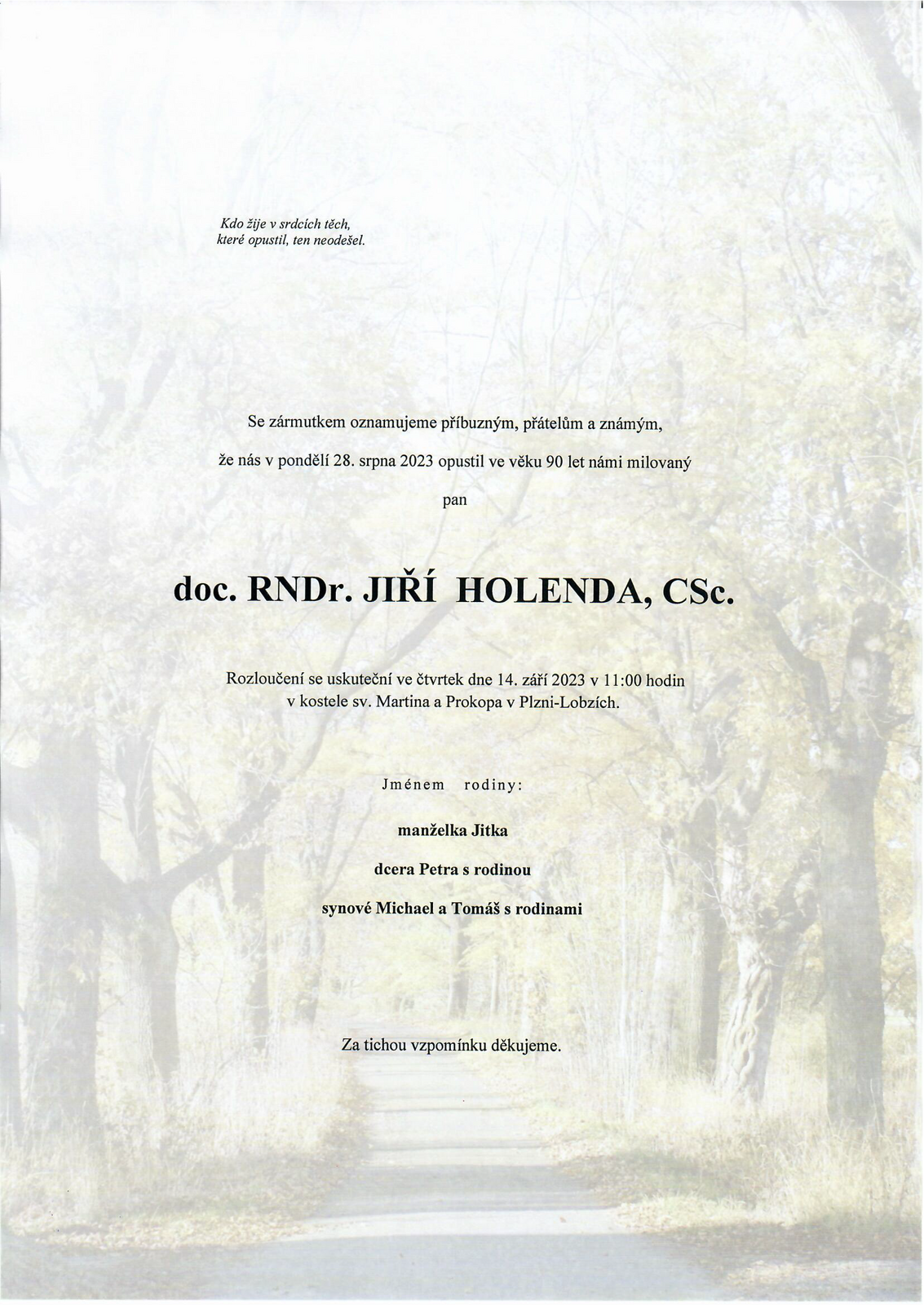 Poslední rozloučení s Jiřím Holendou se uskuteční ve čtvrtek 14. září v 11 hodin v kostele sv. Martina a Prokopa v Plzni-Lobzích.