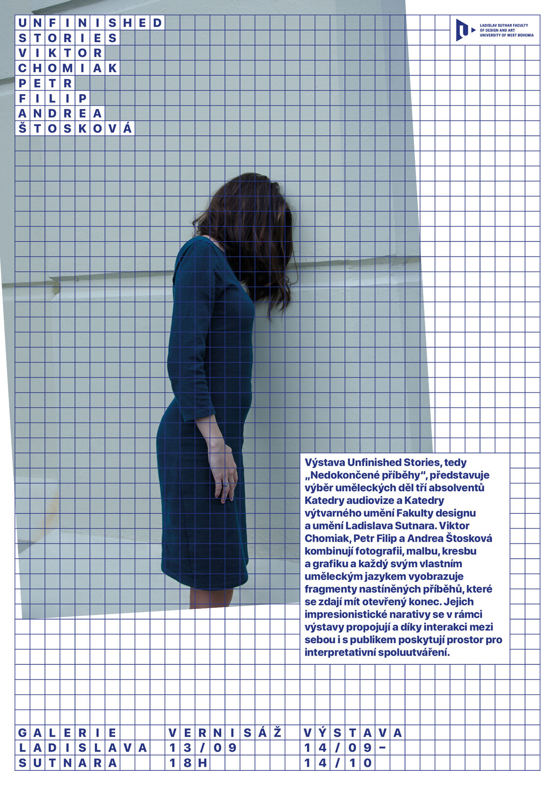Výstava Unfinished Stories, tedy „Nedokončené příběhy“, představuje výběr uměleckých děl Andrey Štoskové, absolventky ateliéru Grafika, absolventa ateliéru Fotografie Viktora Chomiaka a Petra Filipa z ateliéru Socha a prostor. Jak samotné názvy ateliérů napovídají, vystavená díla kombinují fotografii, malbu, kresbu a grafiku, a každý z autorů svým vlastním uměleckým jazykem vyobrazuje fragmenty nastíněných příběhů, které se zdají mít otevřený konec. Jejich impresionistické narativy se v rámci výstavy propojují a díky interakci mezi sebou i s publikem poskytují prostor pro interpretativní spoluutváření.
