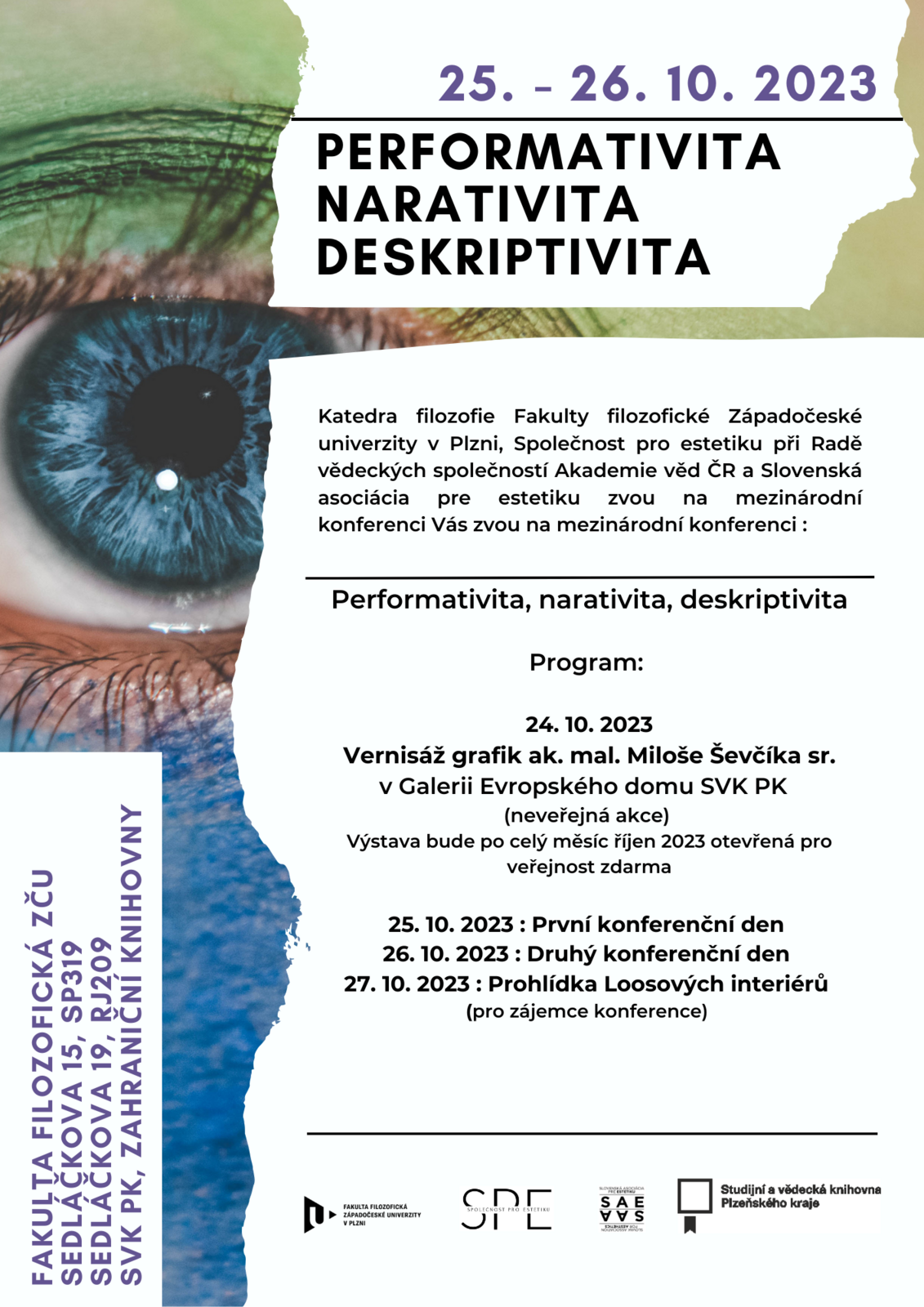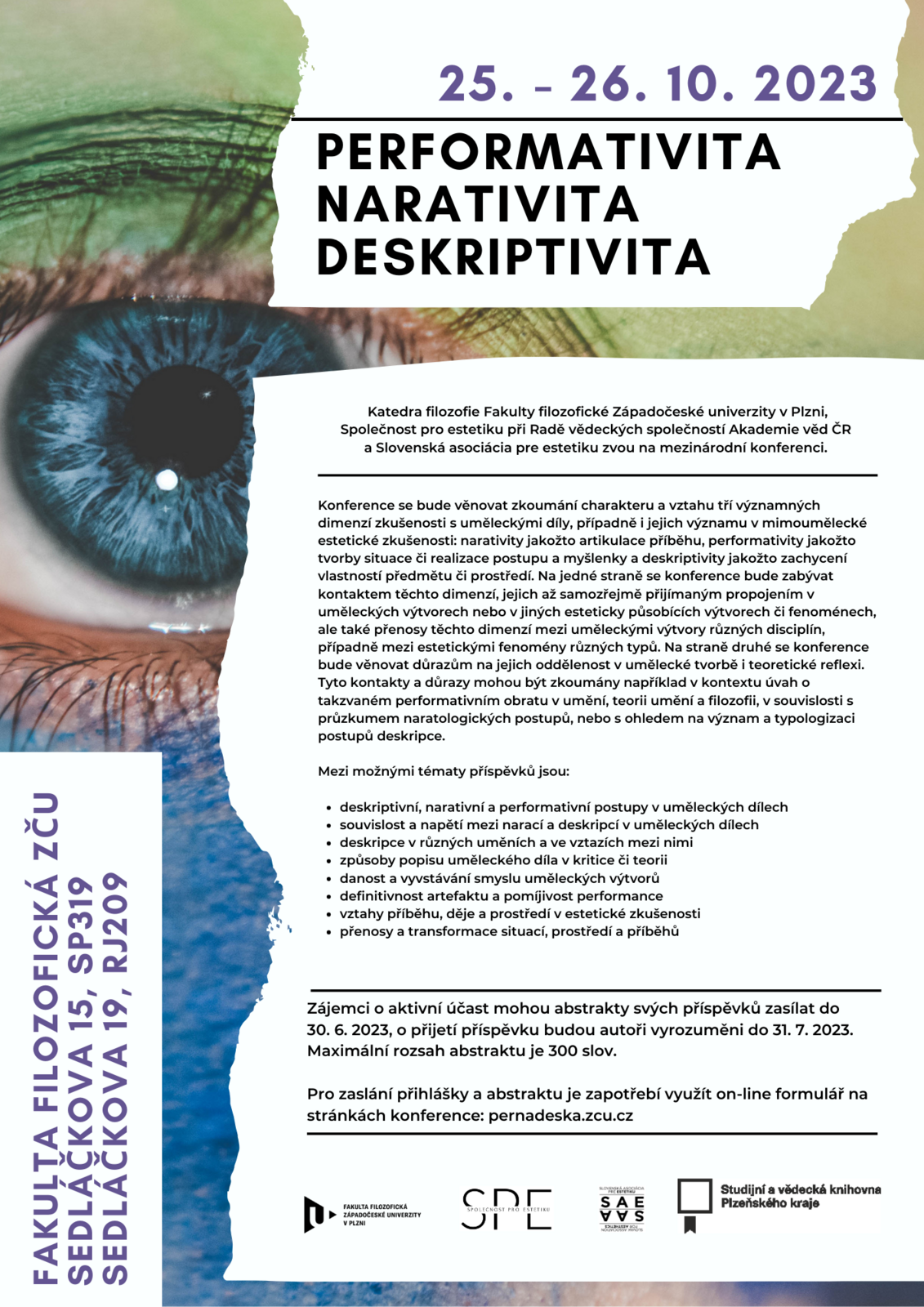 Konference se bude věnovat zkoumání charakteru a vztahu tří významných dimenzí zkušenosti s uměleckými díly, případně i jejich významu v mimoumělecké estetické zkušenosti: narativity jakožto artikulace příběhu, performativity jakožto tvorby situace či realizace postupu a myšlenky a deskriptivity jakožto zachycení vlastností předmětu či prostředí.