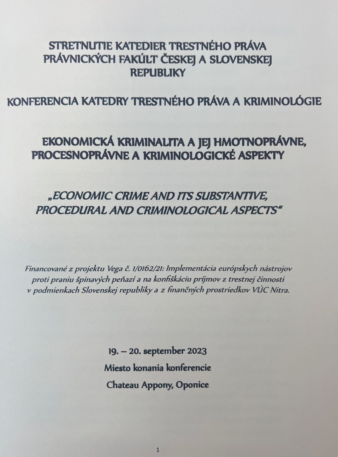 Ve dnech 19. a 20. září se v Oponicích na Slovensku uskutečnila akce, která měla dvojí charakter. Jednalo se o Setkání kateder trestního práva právnických fakult České a Slovenské republiky a zároveň mezinárodní vědeckou konferenci Ekonomická kriminalita a její hmotněprávní, procesněprávní a kriminologické aspekty.