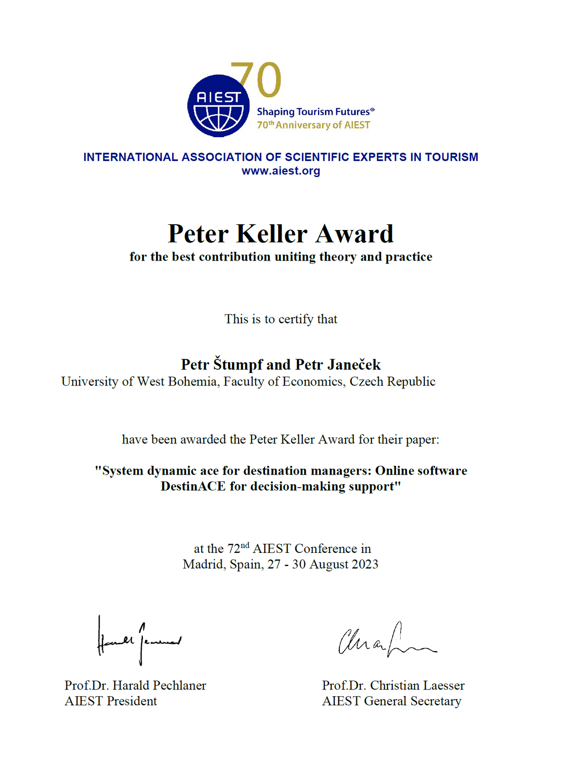 “We are deeply honoured by the Peter Keller Award. Our meeting with him two years ago in Lucerne was a great inspiration. In his active career, he contributed to the development of tourism both in academia and in practice in many international institutions. Together with the founders of AIEST, he also made a significant contribution to the promotion of tourism as a scientific discipline. After second place in the Best Contributions category two years ago, we have once again confirmed this year that in this discipline Czech scientists can compare themselves with the world’s best,” added Petr Štumpf.