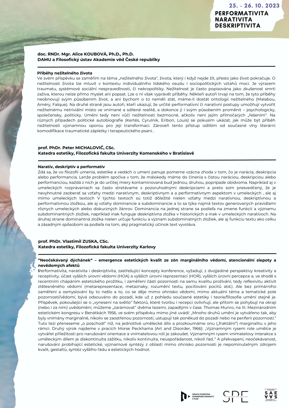 Mezinárodní estetická konference bude zkoumat charakter a vztah tří významných dimenzí zkušenosti s uměleckými díly, případně i jejich význam v mimoumělecké estetické zkušenosti: narativity jakožto artikulace příběhu, performativity jakožto tvorby situace či realizace postupu a myšlenky a deskriptivity jakožto zachycení vlastností předmětu či prostředí.
