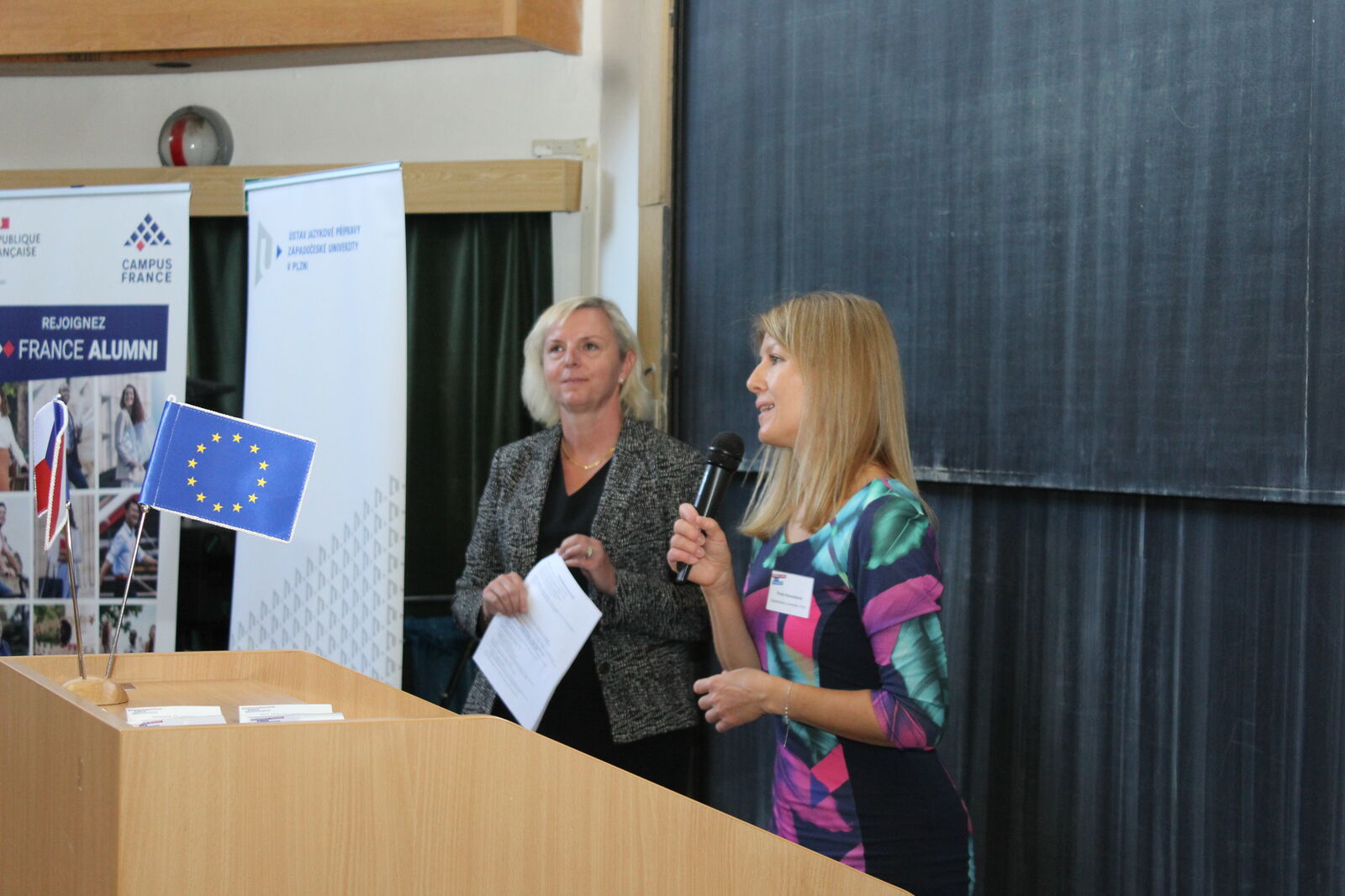 O své zkušenosti se studijním pobytem ve Francii se s posluchači podělily absolventky programu pro studenty a studentky středních škol „Un an en France“ a „Erasmus+“. Následovala prezentace proděkanky FF Heleny Horové a Pavly Kocourkové z Ústavu jazykové přípravy o francouzštině a o jejím využití v praxi a Jana Kozlová, ředitelka Francouzské aliance v Plzni, představila aktivity této instituce. Hana Delalande z Masarykovy univerzity seznámila posluchače se svým projektem Interaktivní mapa francouzštiny.