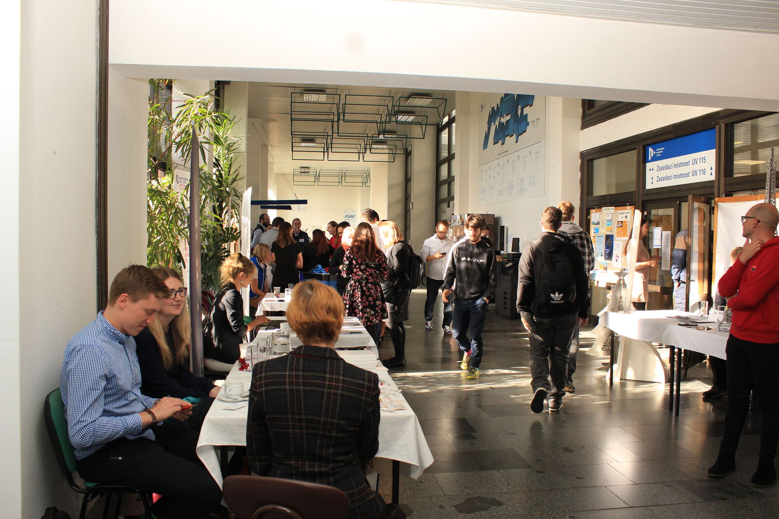 Na chodbě Fakulty strojní se až do odpoledních hodin prezentovaly firmy Safran, Forvia, Faiveley Transport, Wabtec, Bluelink, Oxymetal, Total Energies, Hutchinson a Komerční banka. Zastoupena byla i Francouzsko-česká obchodní komora.