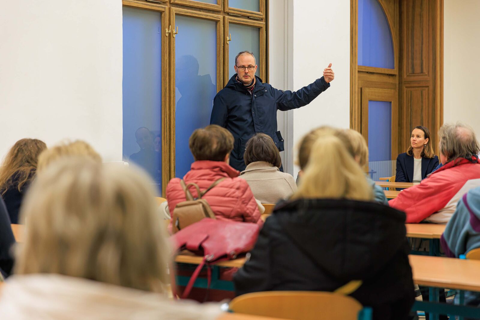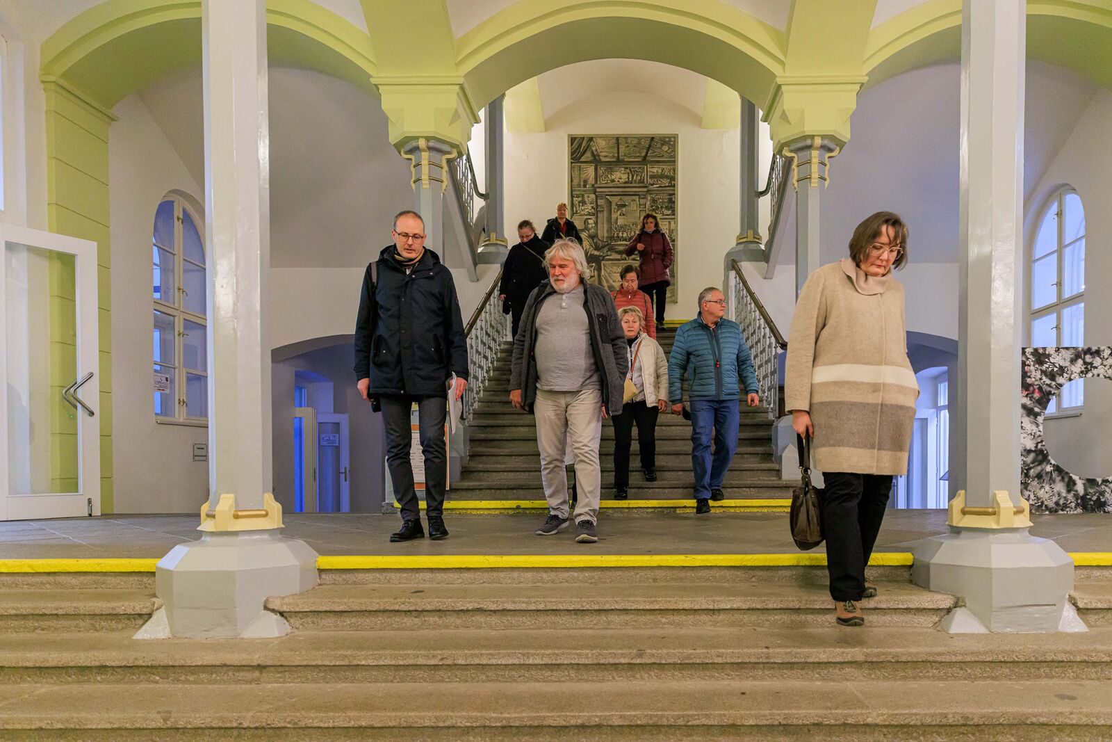 V budově Fakulty pedagogické se výklad odehrál v prostorách auly – bývalé kaple, v budově Fakulty právnické zase v posluchárně, jež bývala vzorkovou prodejnou hornobřízských keramických závodů, což dodnes připomínají barevné obkladačky na chodbě a falešný ukázkový krb uvnitř. Na Fakultě zdravotnických studií se hlavní architektonickou hvězdou stalo honosné schodiště.