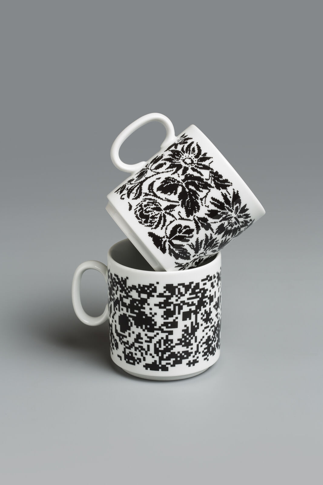 Kristýna Blínová: Digitální střepy / Motiv na hrnku vznikl digitálním roztříštěním již existujícího, konkrétního dekoru ze sedmdesátých let. Rozbíjením, dekonstruováním „porcelánu“ v počítači a následným slepením jeho různorodých střepů zpátky dohromady vzniká nový, modernizovaný motiv, který v sobě stále uchovává duši toho předešlého.