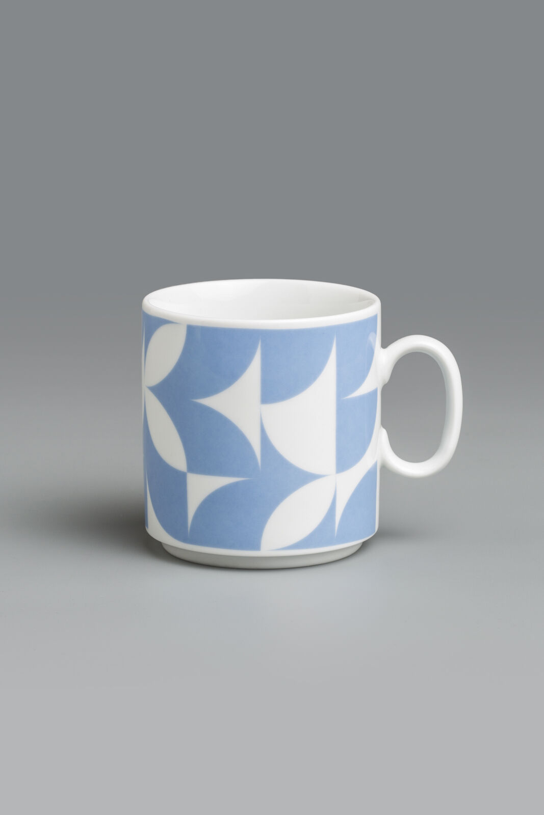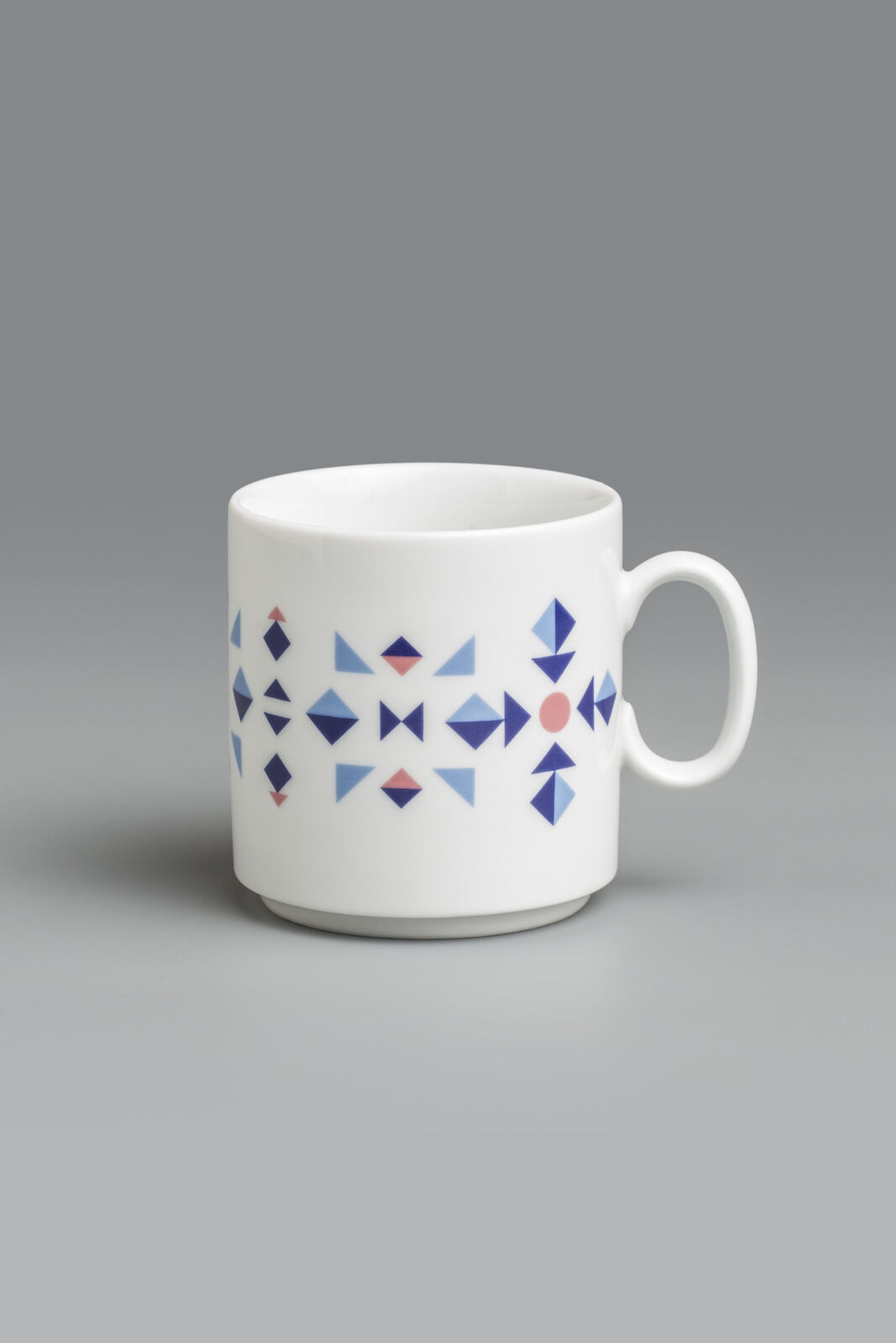 Kateřina Masáková: Palindrom / Motiv je navržen formou palindromu, kdy je možné jej pozorovat z obou stran. Design tvoří tři geometrické tvary, které vytváří různé vzorce. Velkou inspirací se stal geometrický dekor a barevnost hrnku z období normalizace.