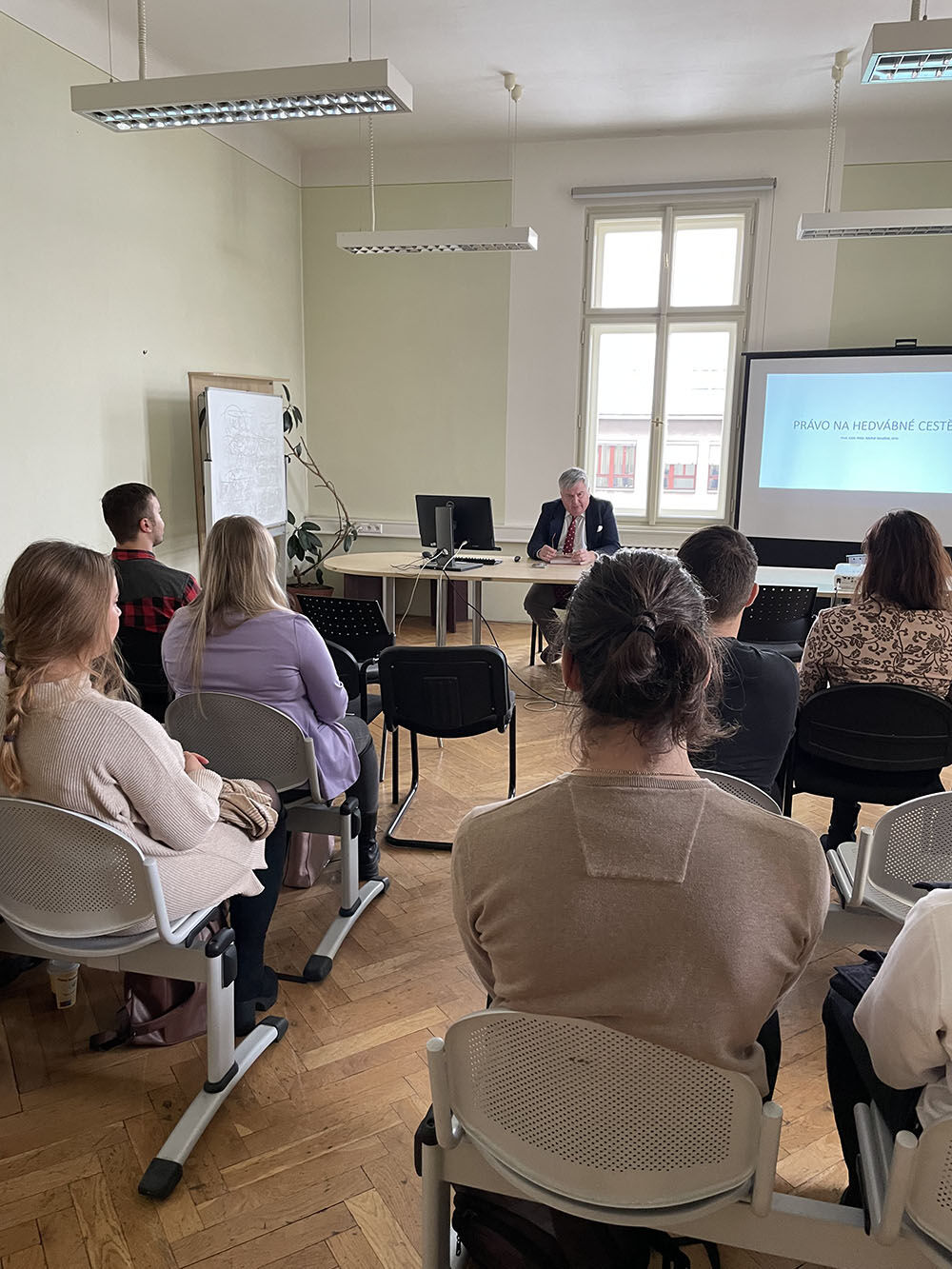 Přítomné studenty a studentky uvedl Michal Tomášek do tématu, které zpracoval ve své stejnojmenné knize. Shrnul vývoj právních vztahů spojených s obchodem na Hedvábné cestě, přičemž přiblížil historii vztahů Číny s okolními státy a evropskými mocnostmi v kontextu Hedvábné cesty i v kontextu střetu různých náboženství. Poukázal také na odlišnosti mezi kontinentálním právním systémem a právním systémem Číny. Závěrečná část přednášky zahrnovala diskusi o právním postavení cizinců v Číně a o vztazích mezi Japonskem a Čínou.