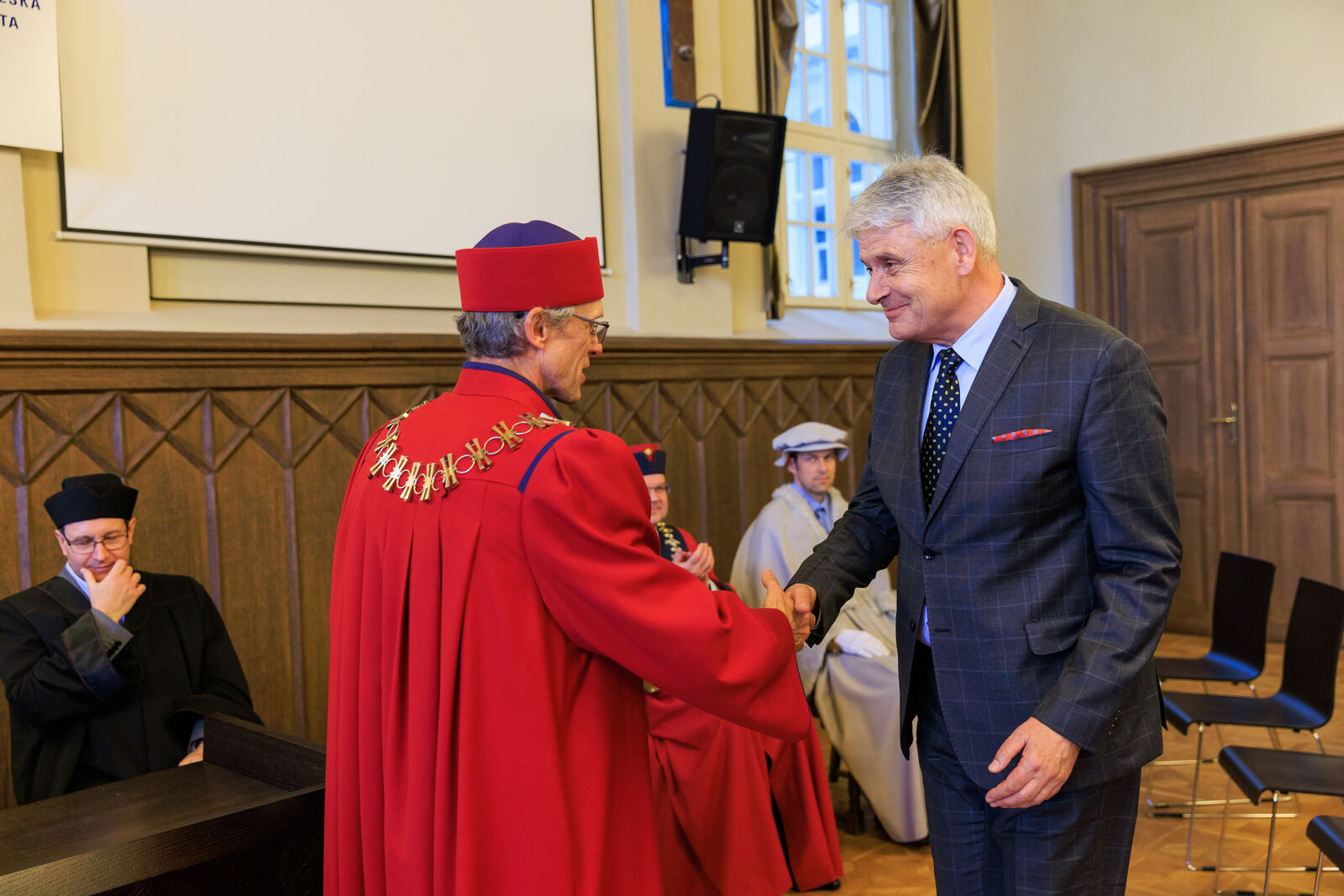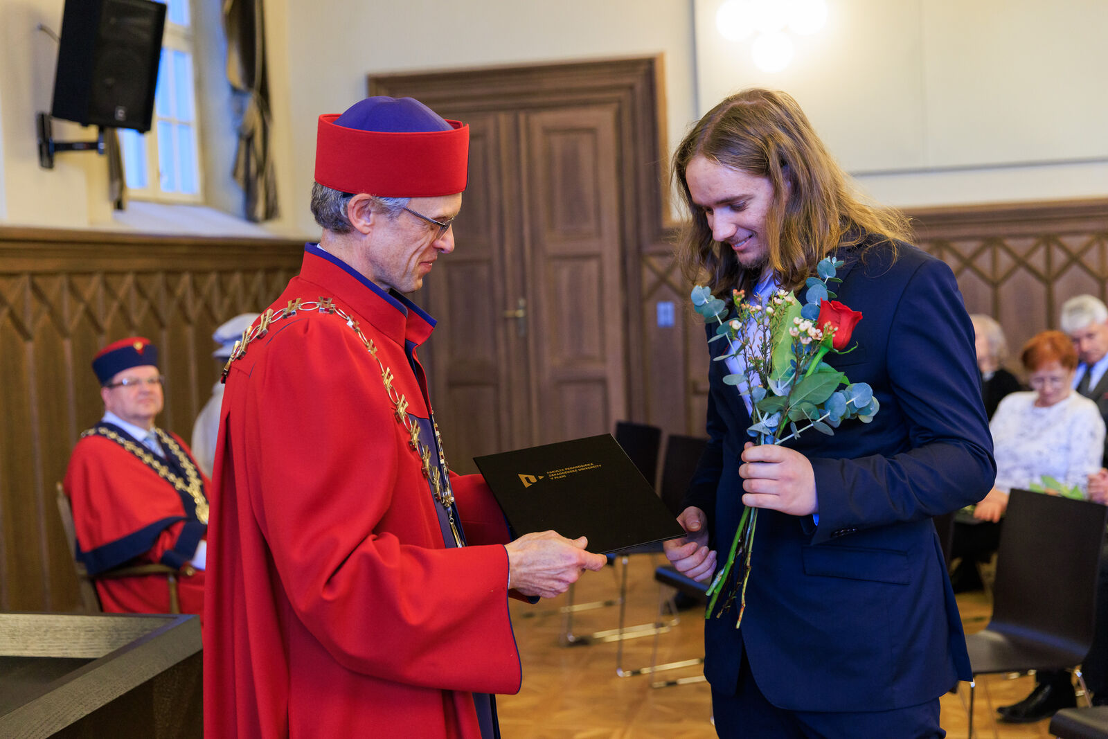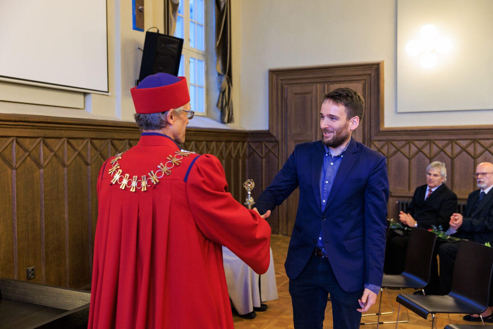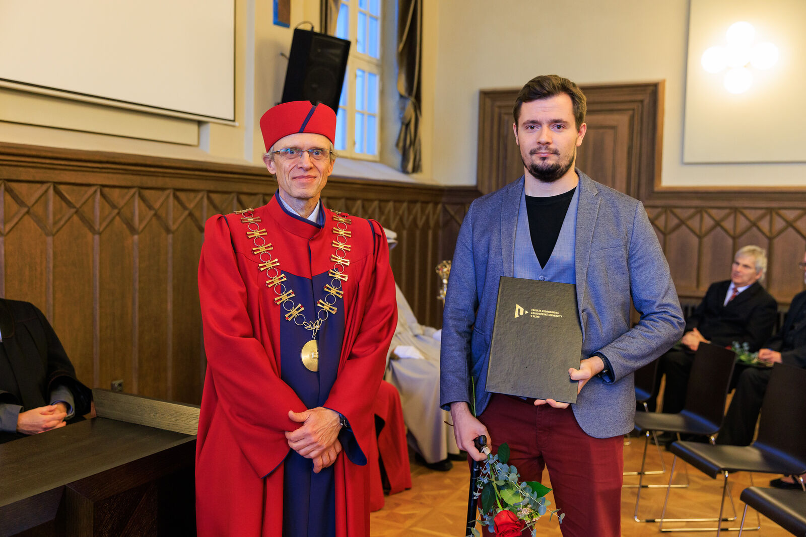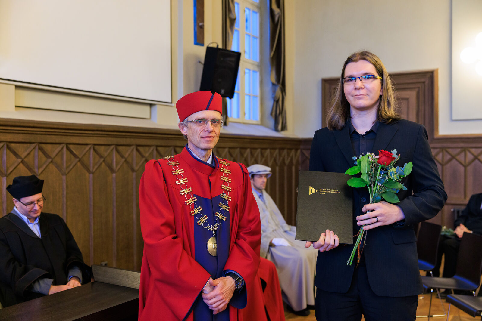 Čestné uznání děkana za dlouhodobou spolupráci a podporu vzdělávání učitelů bylo předáno i Matouši Bořkovcovi a Jakubu Drbohlavovi z MŠMT, kteří se svou činností zejména v rámci Reformy pregraduální přípravy učitelů zásadně podílí na rozvoji přípravy budoucích učitelů.