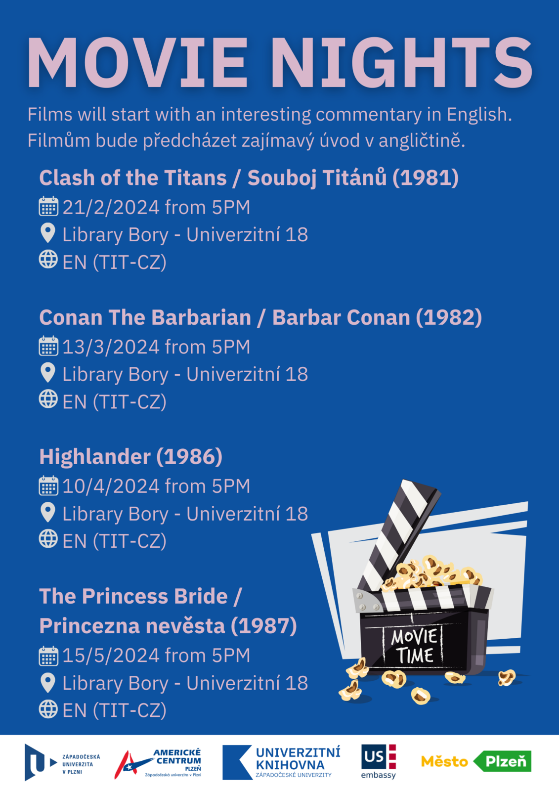Celkem se můžete těšit v rámci filmových večerů v knihovně na čtyři snímky: ve středu 21. února na film Souboj Titánů (Clash of the Titans, 1981), ve středu 13. března na kultovní snímek Barbar Conan (Conan The Barbarian, 1982), ve středu 10. dubna film Highlander (1986) a konečně ve středu 15. května na snímek Princezna nevěsta (The Princess Bride, 1987).