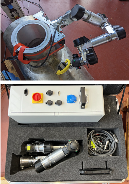 Obrázek 1: Vyvinutý sedmiosý robot pro nedestruktivní testování svarových spojů komponent nejen v jaderných elektrárnách. Robot se vyznačuje možností velmi obratné manipulace s testovacími ultrazvukovými sondami a také možností učení testovacích pohybů operátory nedestruktivního testování