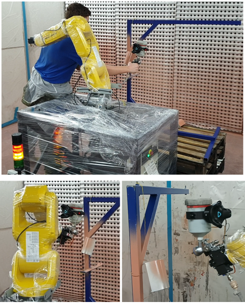 Obrázek 3: Technické rozšíření robotu Fanuc LRMate 200iD pro naučení pohybů lakovací pistole operátorem - zkušeným lakýrníkem a následná automatická replikace pohybu lakovací pistole robotem.