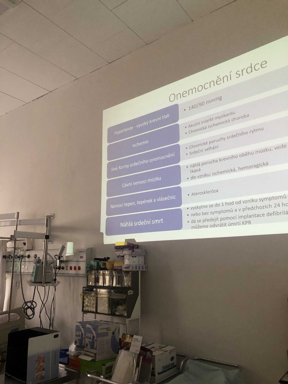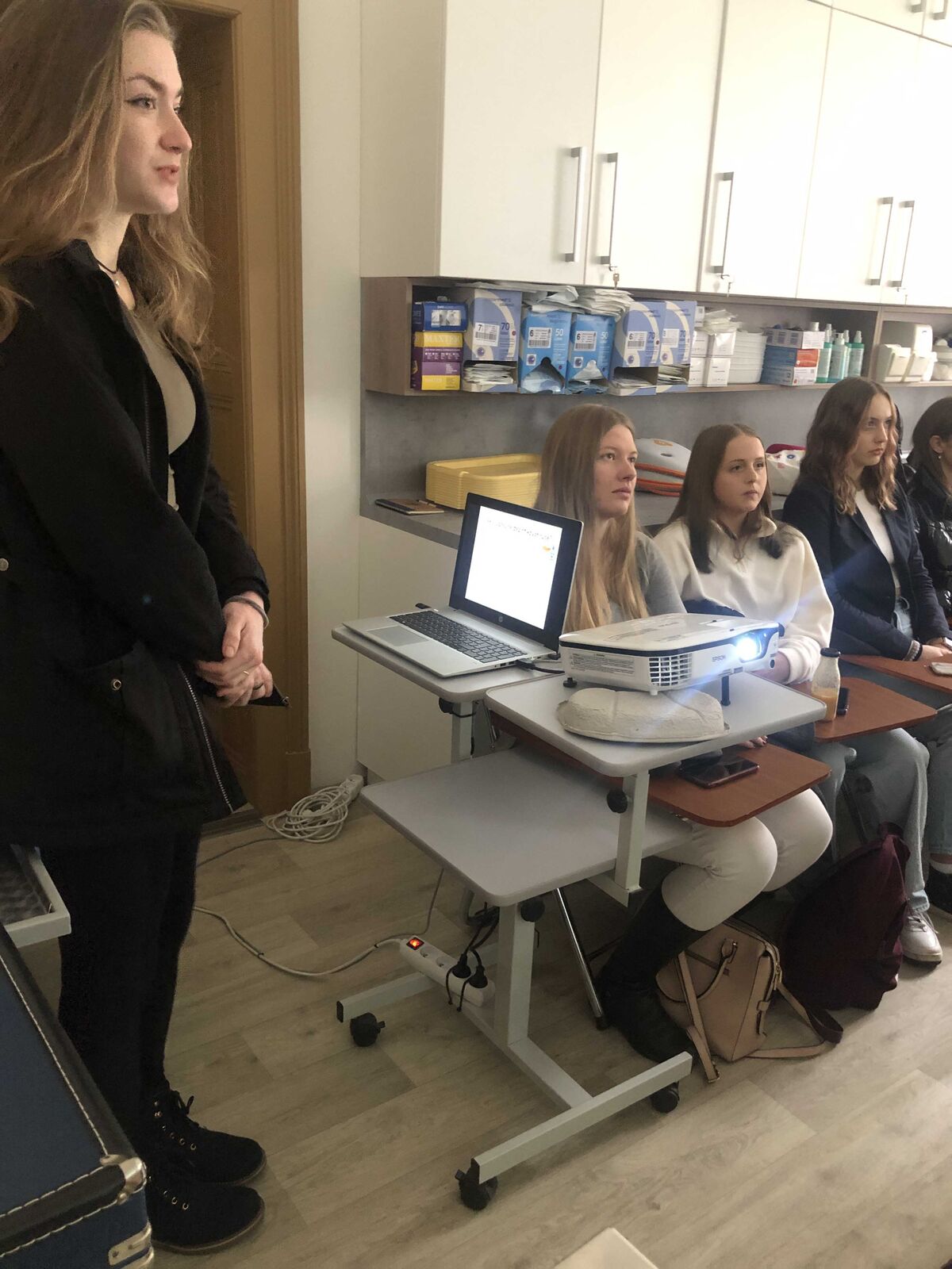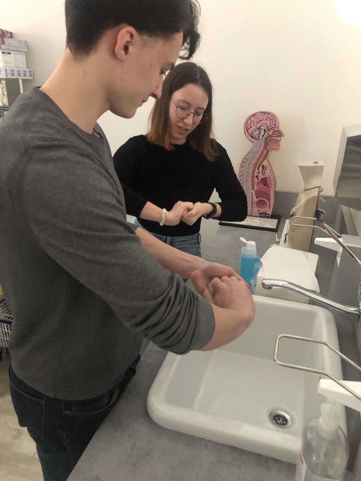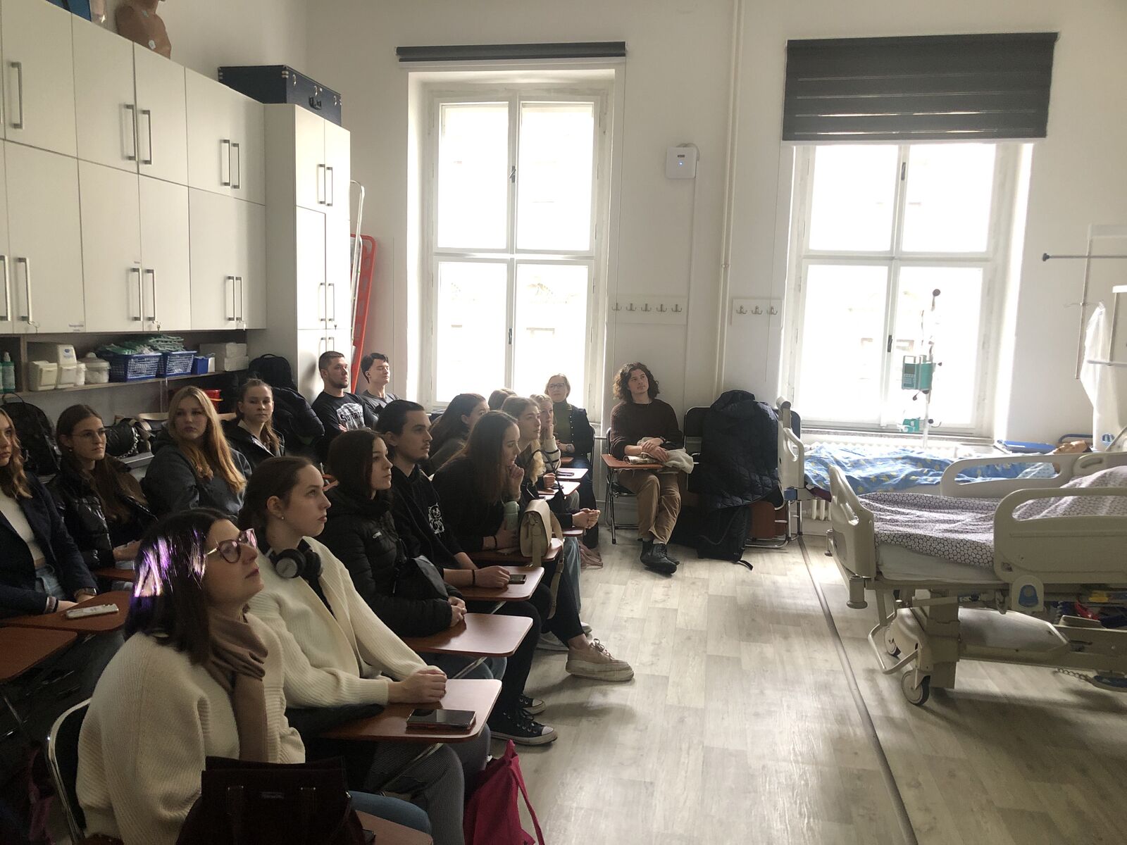 Dalším bodem programu, který zaštítila katedra ošetřovatelství a porodní asistence, byla návštěva odborné učebny pro sestry v prostorách FZS. Studentka oboru Všeobecné ošetřovatelství pro ně připravila prezentaci na téma Hygiena rukou, dále proběhl nácvik hygienické dezinfekce rukou pomocí fluoreskující emulze a UV lampy, do kterého se zapojili všichni žáci a žákyně gymnázia. Další studentka oboru Všeobecné ošetřovatelství prezentovala téma EKG a srdeční choroby. Jedna z gymnazistek měla možnost EKG přístroj vyzkoušet a podívat se tak na popis registrace na EKG, popis EKG křivky a vysvětlení patologických hodnot. Program v této odborné učebně zahrnoval i předvedení makety AED a použití pulzního oxymetru spolu s vysvětlením fyziologických hodnot pulzu.
