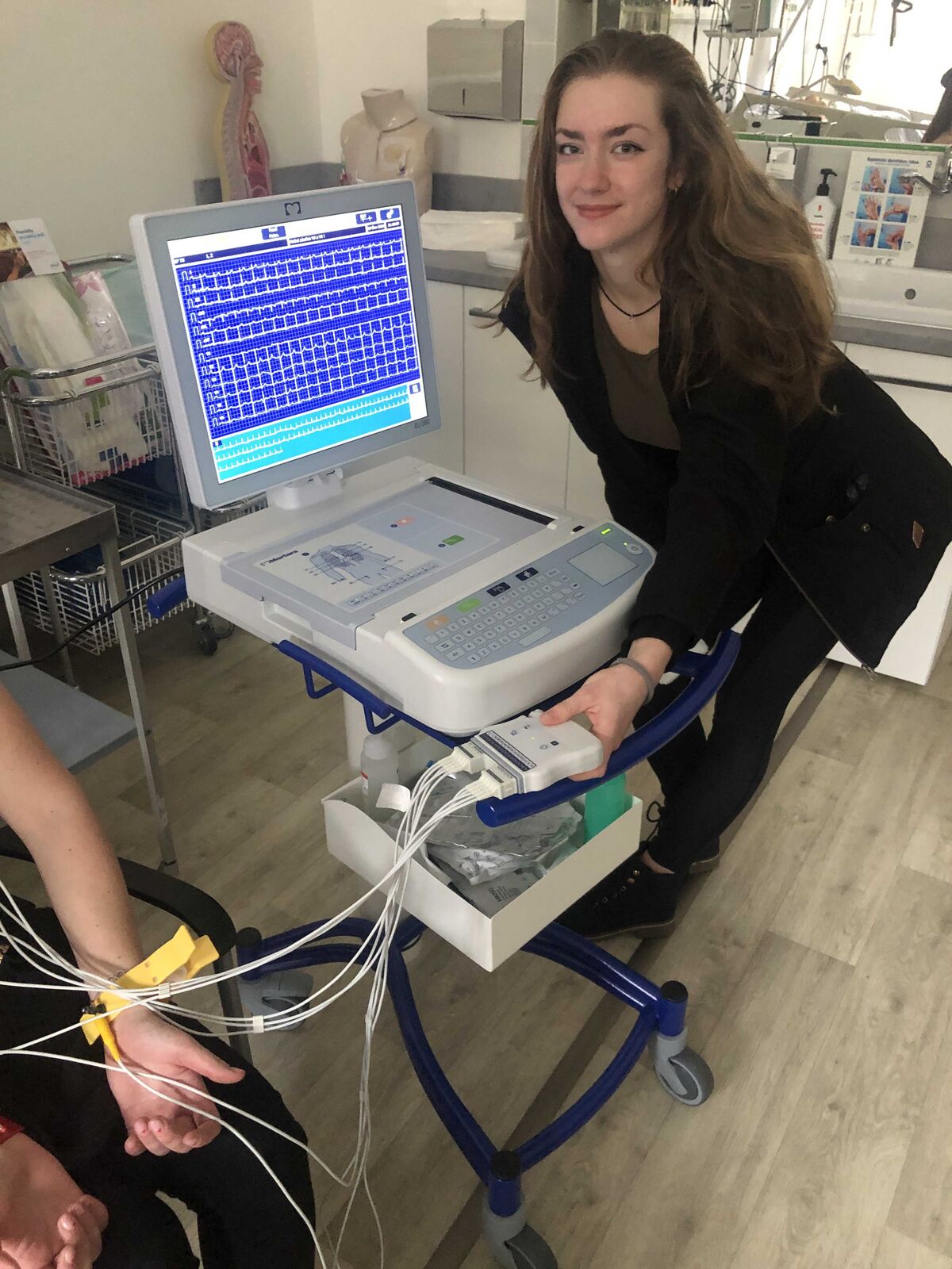 The next point of the programme was a visit to the professional classroom for nurses in the premises of the FZS, where the programme was covered by the Department of Nursing and Midwifery. A student of General Nursing prepared a presentation on the theme Hand hygiene, as well as a training on hygienic hand disinfection using fluorescent emulsion and UV lamp, which involved all pupils of the gymnasium. Another student of General Nursing presented on ECG and heart diseases. One of the gymnasium students had the opportunity to try out the ECG machine and see the description of the ECG registration, the description of the ECG waveform and the explanation of the pathological values. The programme in this specialized classroom also included a demonstration of a mock AED and the use of a pulse oximeter along with an explanation of the physiological pulse values.