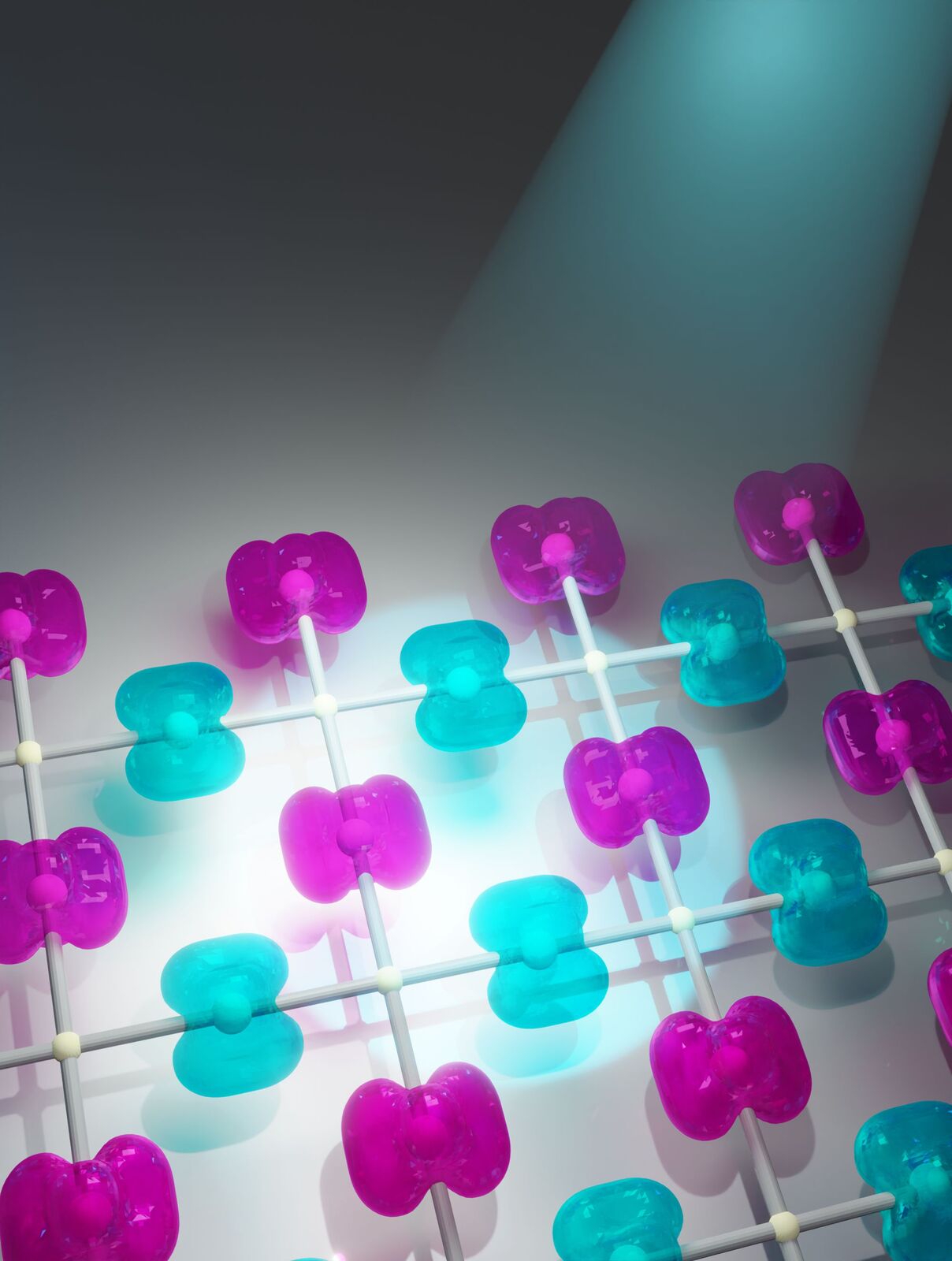 V altermagnetech na sousedních magnetických atomech alternují nejen směry spinové polarizace (znázorněné fialovou a modrou barvou), ale také samotné tvary atomu (znázorněné nakloněním čínkovitě tvarovaných elektronových hustot do dvou různých směrů). Modrý paprsek znázorňuje fotoemisní experiment na synchrotronu, který byl použití k prokázání altermagnetismu. Kredit: Libor Šmejkal, Anna Birk Hellenes - AV ČR