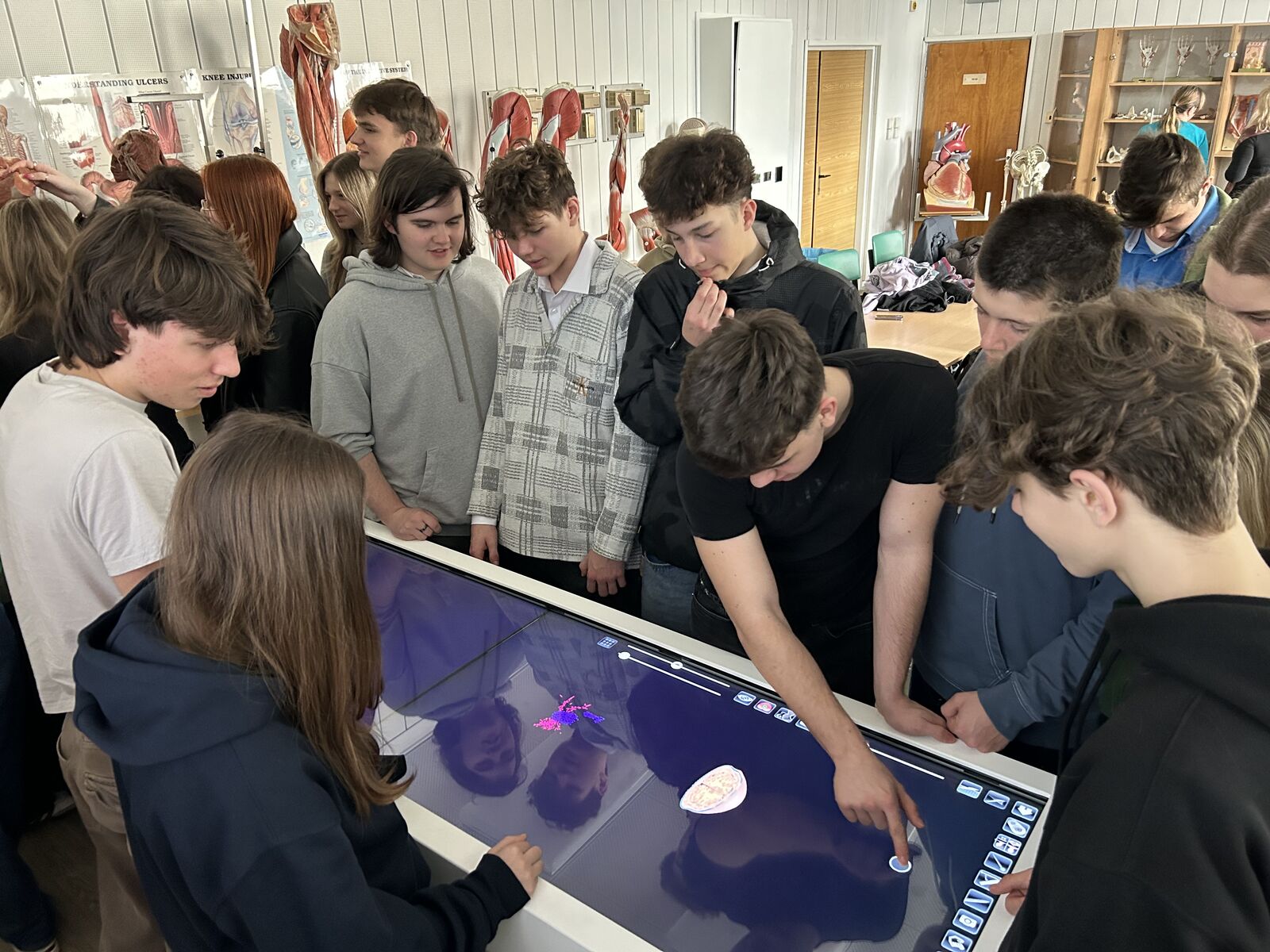 Závěrem workshopu se žákyně a žáci přesunuli do odborné učebny anatomie, kde se dozvěděli informace o FZS a přijímacím řízení. Následovala prezentace vystavených plastinátů torza těla, horní končetiny a dolní končetiny a představení interaktivního pitevního stolu, opět s možností vyzkoušení.