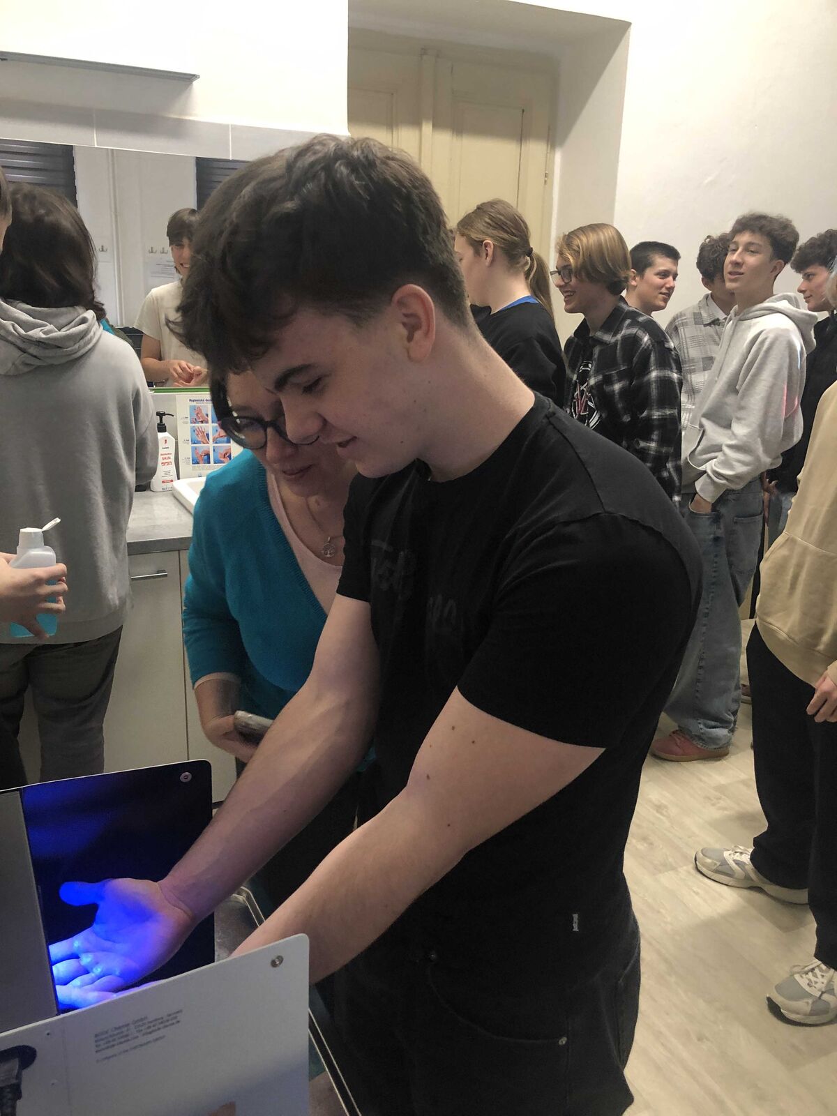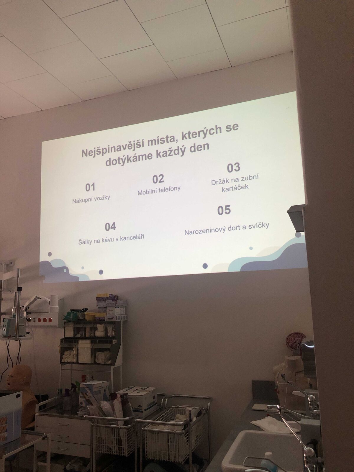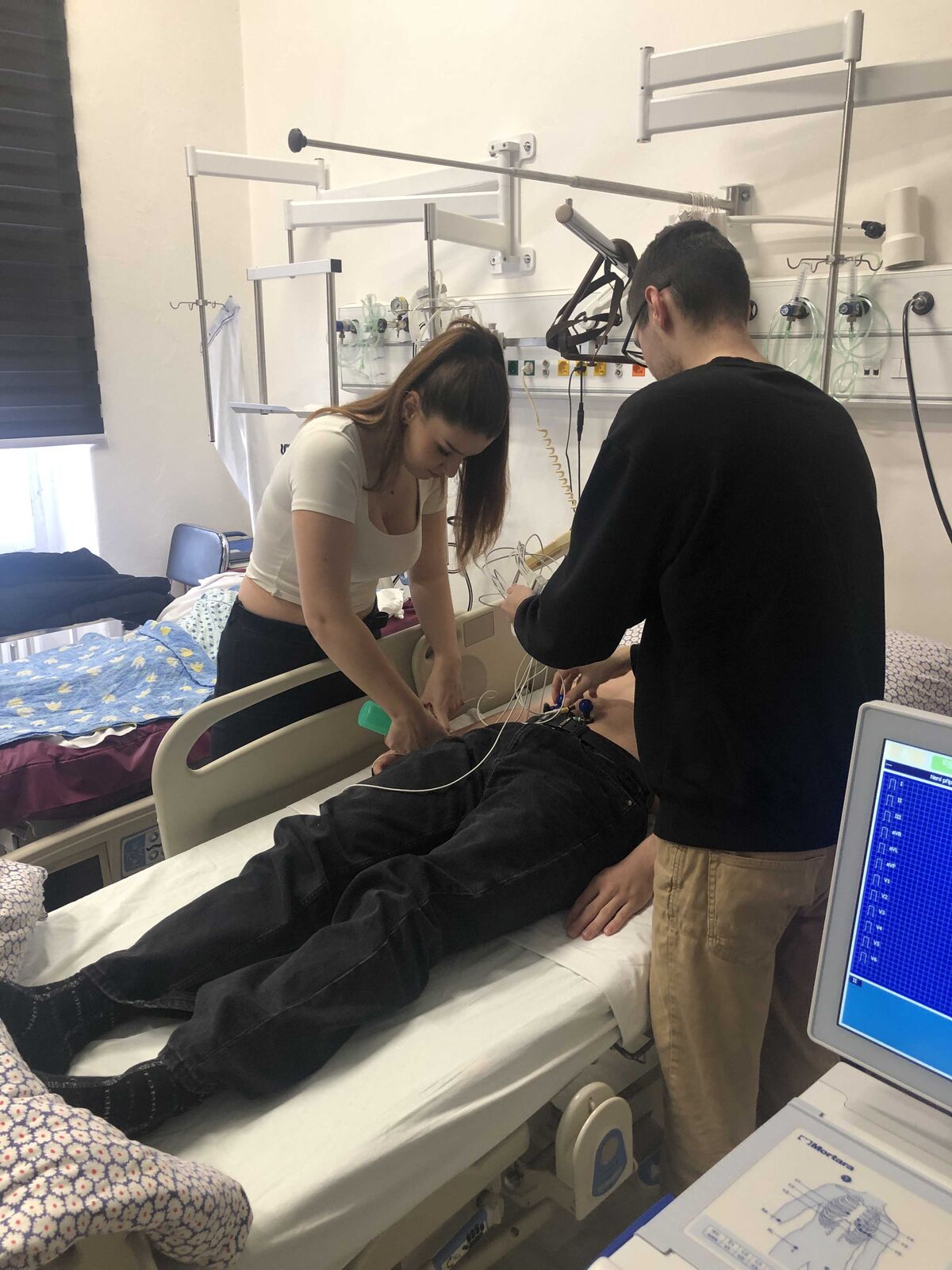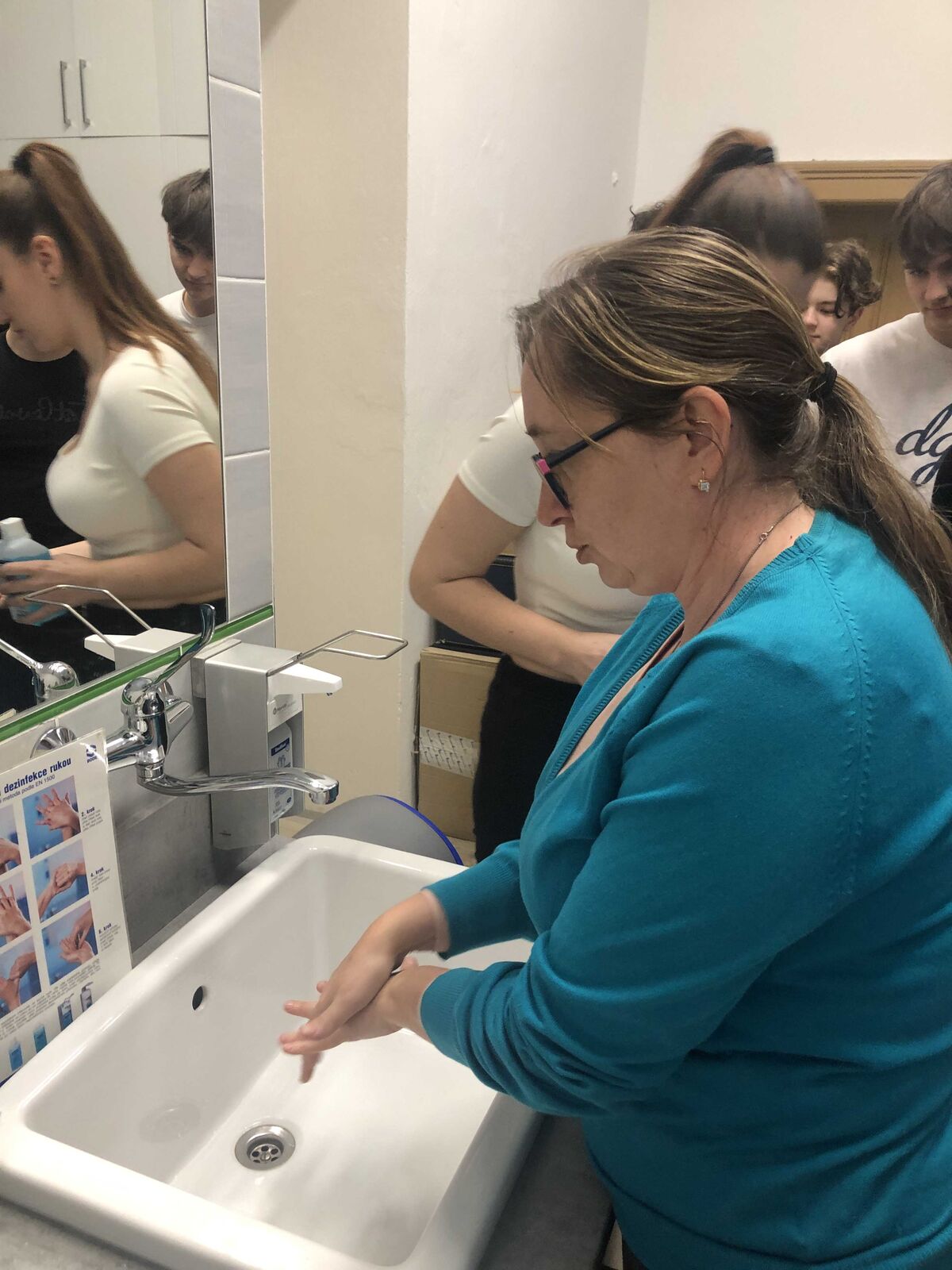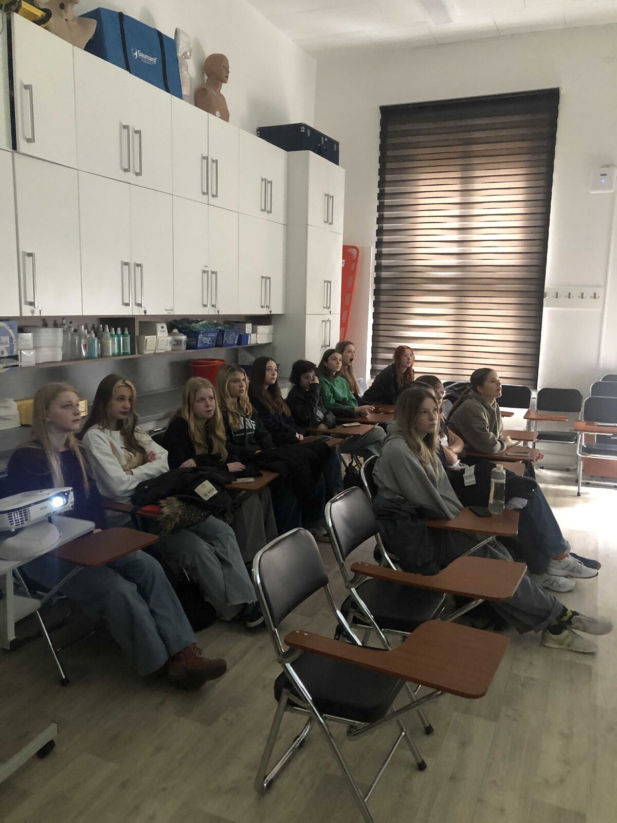 Následovala návštěva odborné učebny pro sestry v sídle FZS, pro niž studující oboru Všeobecné ošetřovatelství připravili prezentaci správné hygieny rukou, další část programu se věnovala nácviku hygienické dezinfekce rukou, kterou si žákyně a žáci mohli opět sami vyzkoušet. Workshop pokračoval tématem EKG a srdečních chorob. Vybraný žák gymnázia si přístroj EKG vyzkoušel na vlastní kůži, prezentace se týkala také registrace na EKG a vysvětlení uvedených patologických hodnot. Blok v této odborné učebně uzavřelo předvedení makety AED a použití oxymetru.