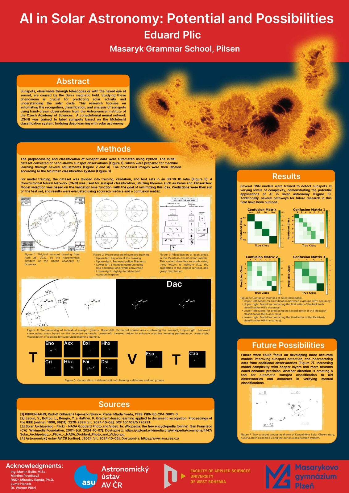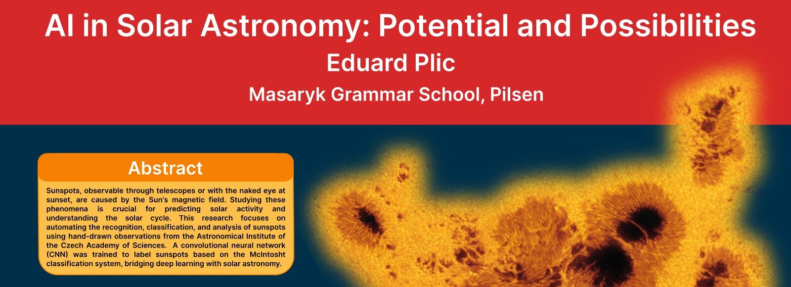 Za práci věnující se klasifikaci slunečních skvrn s využitím umělé inteligence získal Eduard, student plzeňského Masarykova gymnázia, první místo v SOČ v oboru Fyzika a nominaci do mezinárodního kola. Pod vedením Martina Bulína z katedry kybernetiky Fakulty aplikovaných věd ZČU Eduard použil konvoluční neuronovou síť pro klasifikaci skvrn a pracoval s protokolem kresby Slunce. Po rozdělení skvrn do skupin podle mezinárodní klasifikace provedl počítačové zpracování kreseb a trénoval modely strojového učení, které skvrny samy klasifikovaly.