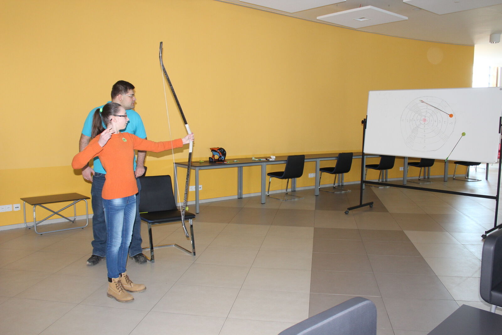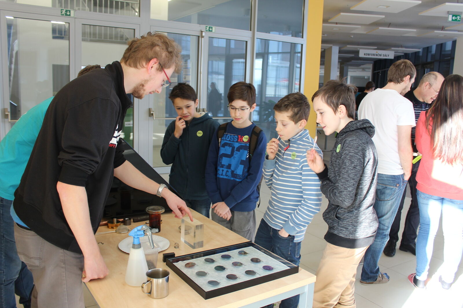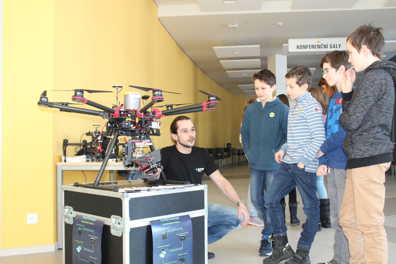 Plno bylo zejména na chodbě před velkými posluchárnami, kde připravily hravé expozice katedry fyziky, matematiky a mechaniky. Chlapci a děvčata si zde mohli prohlédnout třeba tepelné zrcadlo a další unikátní materiály, zjistit princip kyvadla pomocí míče zavěšeného na ocelovém lanku či zastřílet si ze speciálního luku z kompozitního materiálu. U kluků vzbudil velký zájem vystavený dron. Ten představili pracovníci plzeňského centra Dronet, které s fakultou spolupracuje mimo jiné na novém certifikátovém programu Technologie pro bezpilotní létání.