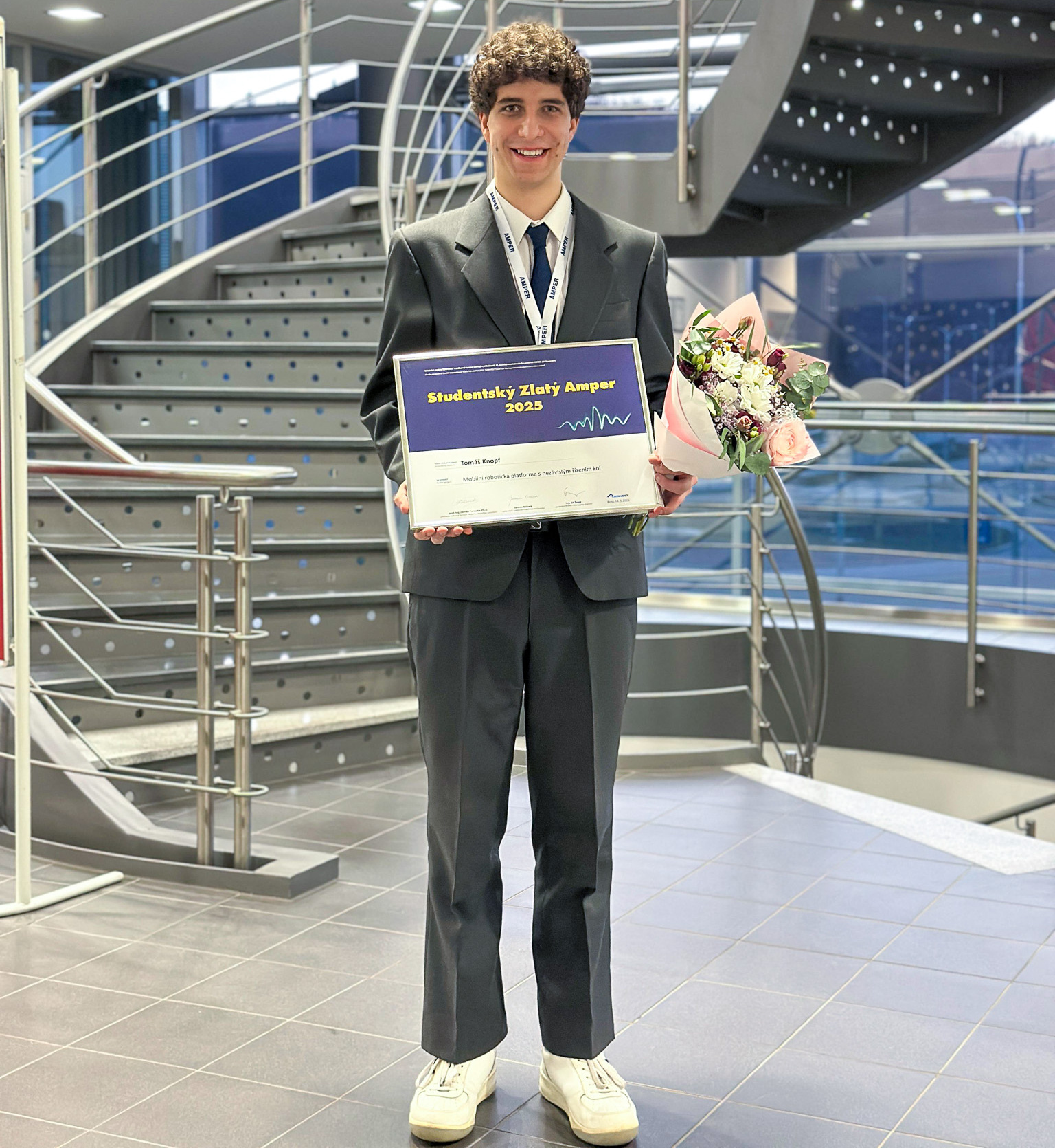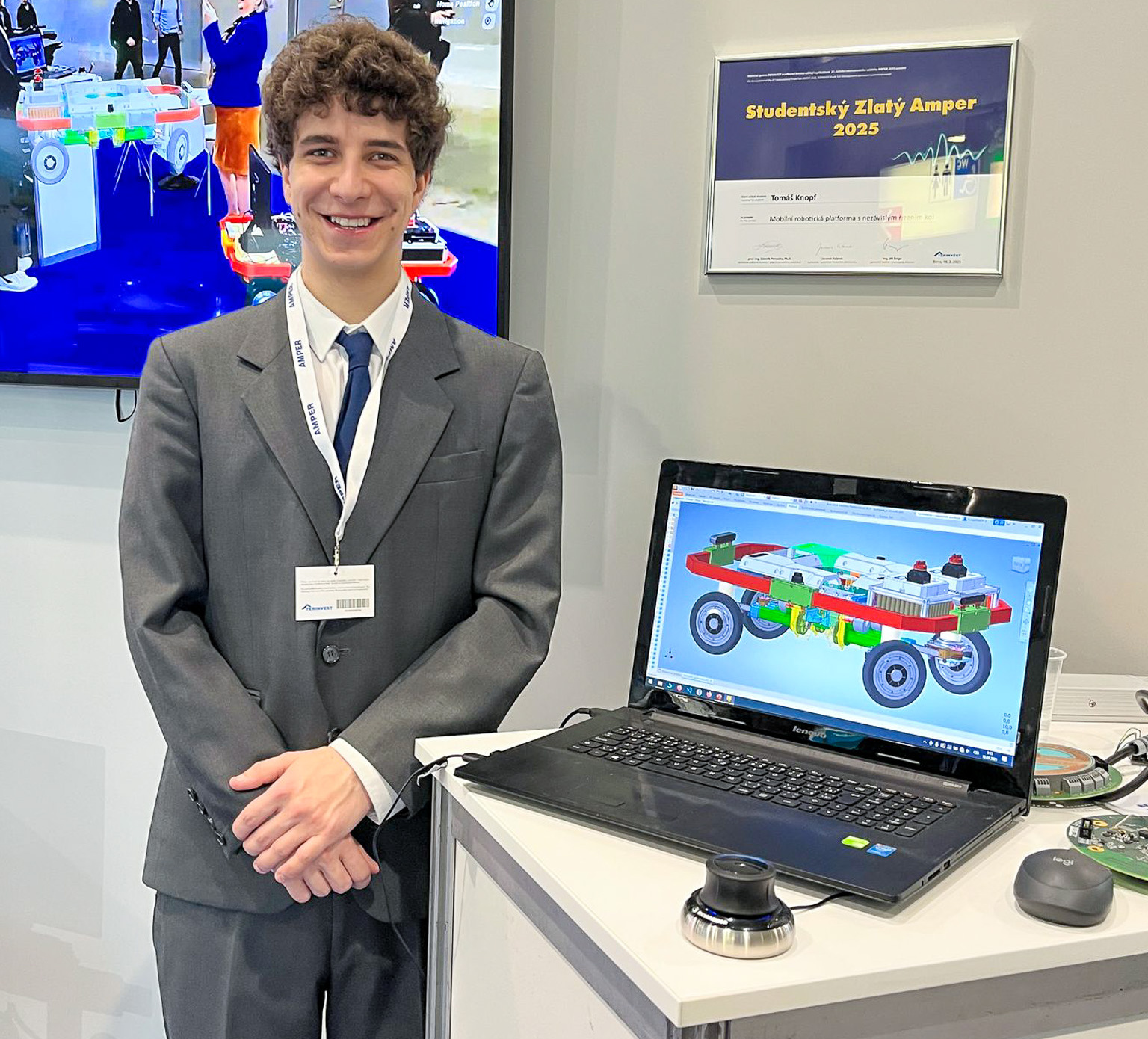 Cena Studentský Zlatý Amper je pak udělována nejlepším studentským projektům s vysokým inovačním potenciálem. Toto ocenění získal Tomáš Knopf, student třetího ročníku bakalářského studia FEL, za svůj projekt mobilní robotické platformy s nezávislým řízením kol.