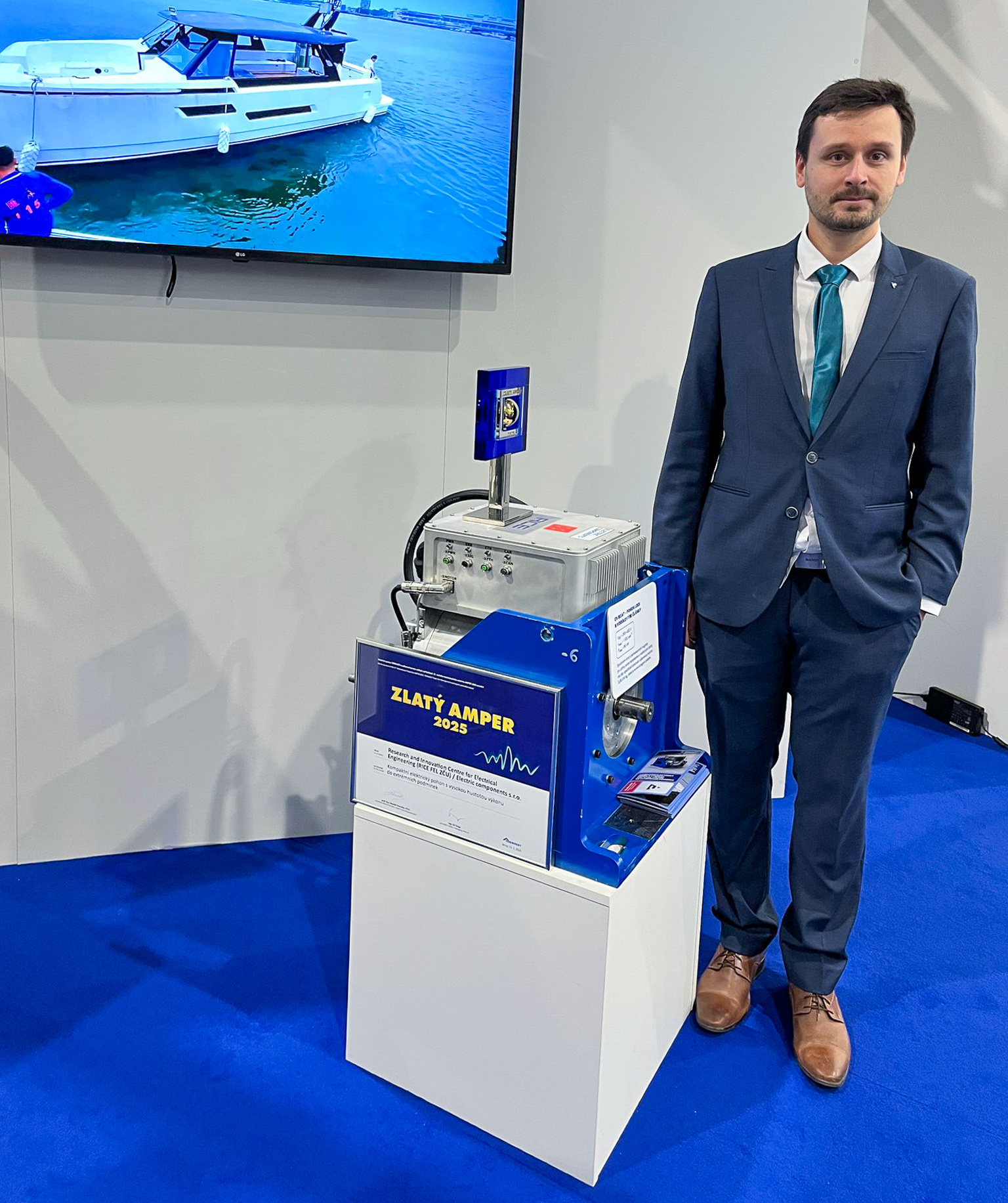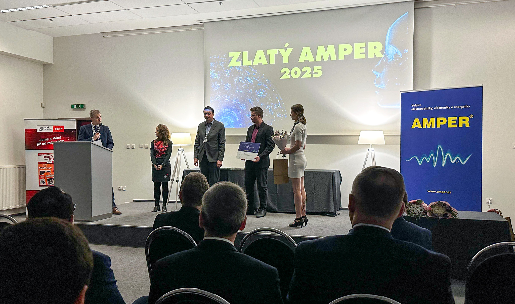 Vůbec nejvyšší ocenění veletrhu, Zlatý Amper, se uděluje za inovativní technologii s významným technickým a praktickým přínosem. Toto prestižní ocenění převzal Patrik Kalaj, student posledního ročníku doktorského studia, za vývoj kompaktní elektrické pohonné jednotky s vysokou hustotou výkonu pro extrémní podmínky.
