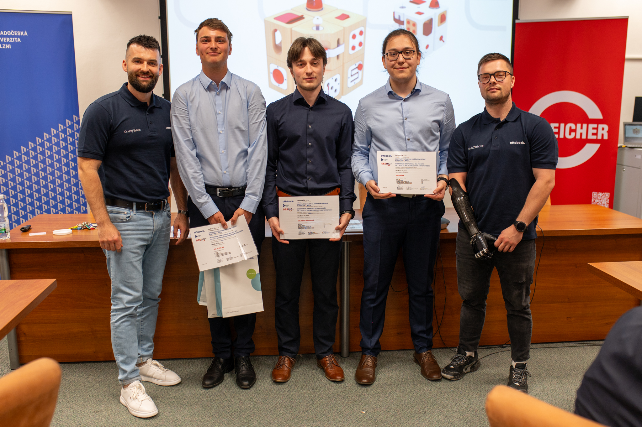 Studující, kteří se zabývali projektem pro firmu Otto Bock ČR, představili terapeutickou hrací kostku pro děti ve věku 3–5 let. Kostka je navržená tak, aby dětem pomohla trénovat úchop pomocí protézy, je z přírodního materiálu a umožňuje dětem rozvíjet motorické dovednosti. „Je příjemný pocit, když víme, že tímto projektem můžeme někomu pomoct, konkrétně dětem s myoprotézou," řekl Jan Popelka. „Vycházeli jsme z montessori hraček tak, aby finální produkt nebyl příliš drahý a byl jednoduchý," doplnil Vojtěch Malinský, oba z Fakulty strojní.