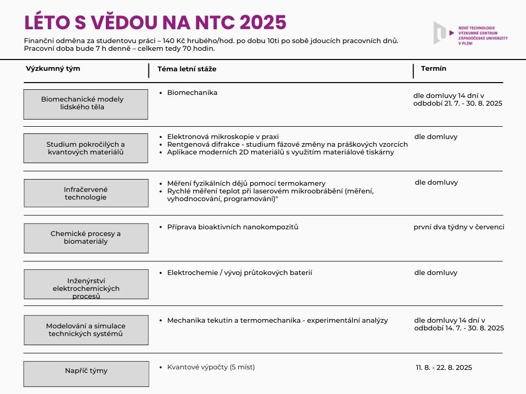 Středoškolačky či středoškoláci, kteří se chtějí stát výzkumníky a strávit léto na NTC ZČU po boku vědců, se mohou hlásit do 26. května 2025. Je třeba, aby na e-mail: bcechuro@ntc.zcu.cz poslali motivační dopis a v něm uvedli, proč chtějí pracovat ve výzkumném centru. Možná právě tato brigáda nastartuje jejich budoucnost ve vědě.