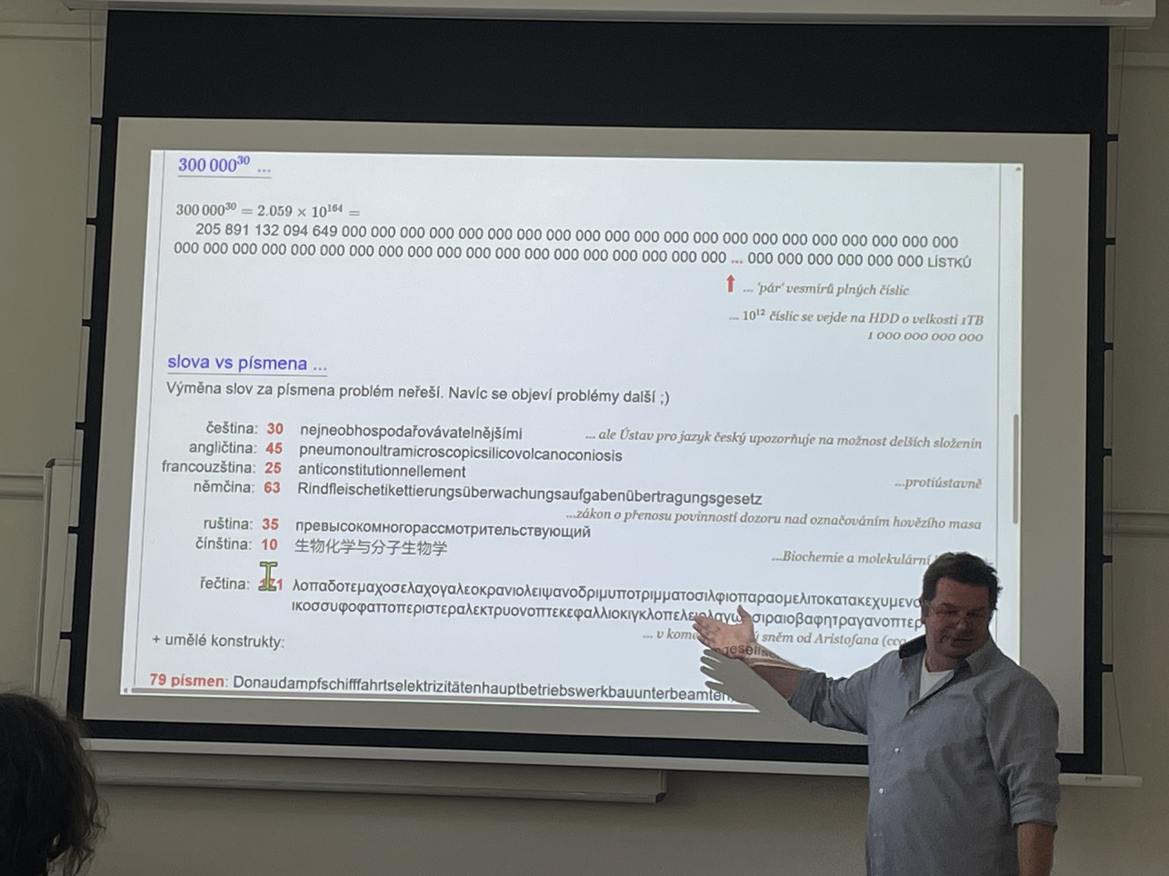 Radek Schuster z katedry filozofie Fakulty filozofické přispěl tématem Jak rozumět vektorům v kontextu filozofie. „Vektorová sémantika bývá interpretována jako aplikace lingvistické distribuční hypotézy, která je odvozována od filozofické koncepce významu jako užití, kterou rozvíjí pozdní Wittgenstein,“ uvedl odborník. Jednoduše řečeno, vektorová sémantika staví na myšlence, že význam slova poznáme podle jeho použití a podle toho, v okolí jakých dalších slov se vyskytuje. Jde o filozofický přístup, který prosazoval filozof Ludwig Wittgenstein. Na Schusterovu prezentaci navázali Jan Čepička a Jan Pospíšil z katedry matematiky Fakulty aplikovaných věd, kteří představili téma slov v kontextu matematiky. V podstatě ukázali, jak lze reprezentovat „užití slova“ pomocí čísel a vektorů v mnohorozměrném prostoru.