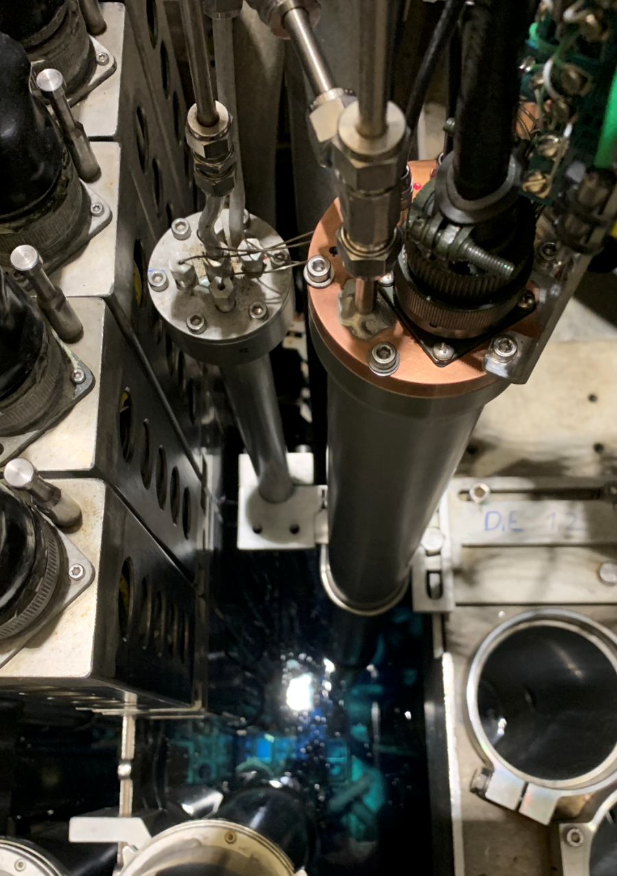 CV Řež - sonda se senzory, dole viditelné Čerenkovovo záření
