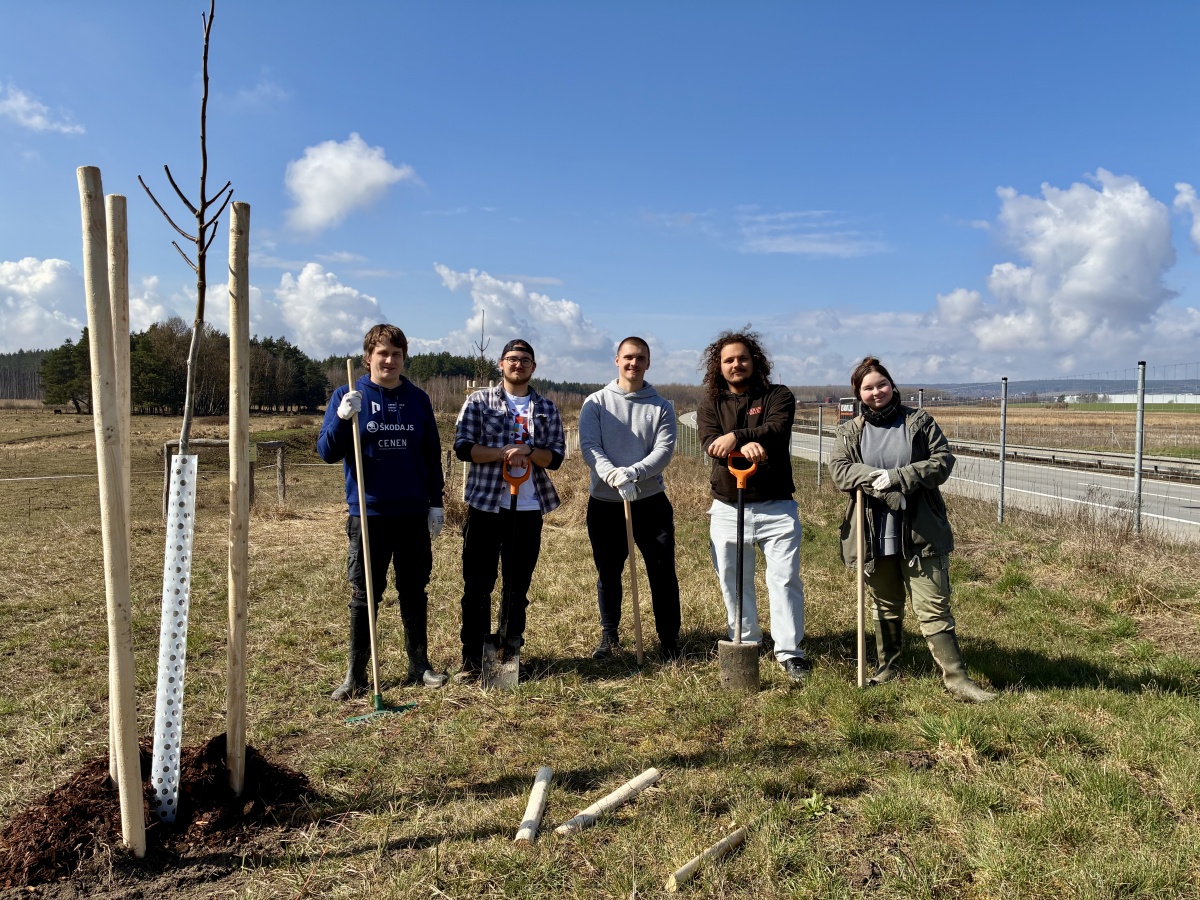 Students and staff of the university, representatives of the Environmental Department of the Pilsen Region, and the leadership of both institutions actively participated in the planting. Before the planting itself, an expert from the Environmental Department demonstrated the proper procedure, after which participants carried out individual tasks—from planting and applying a protective layer to installing fencing.