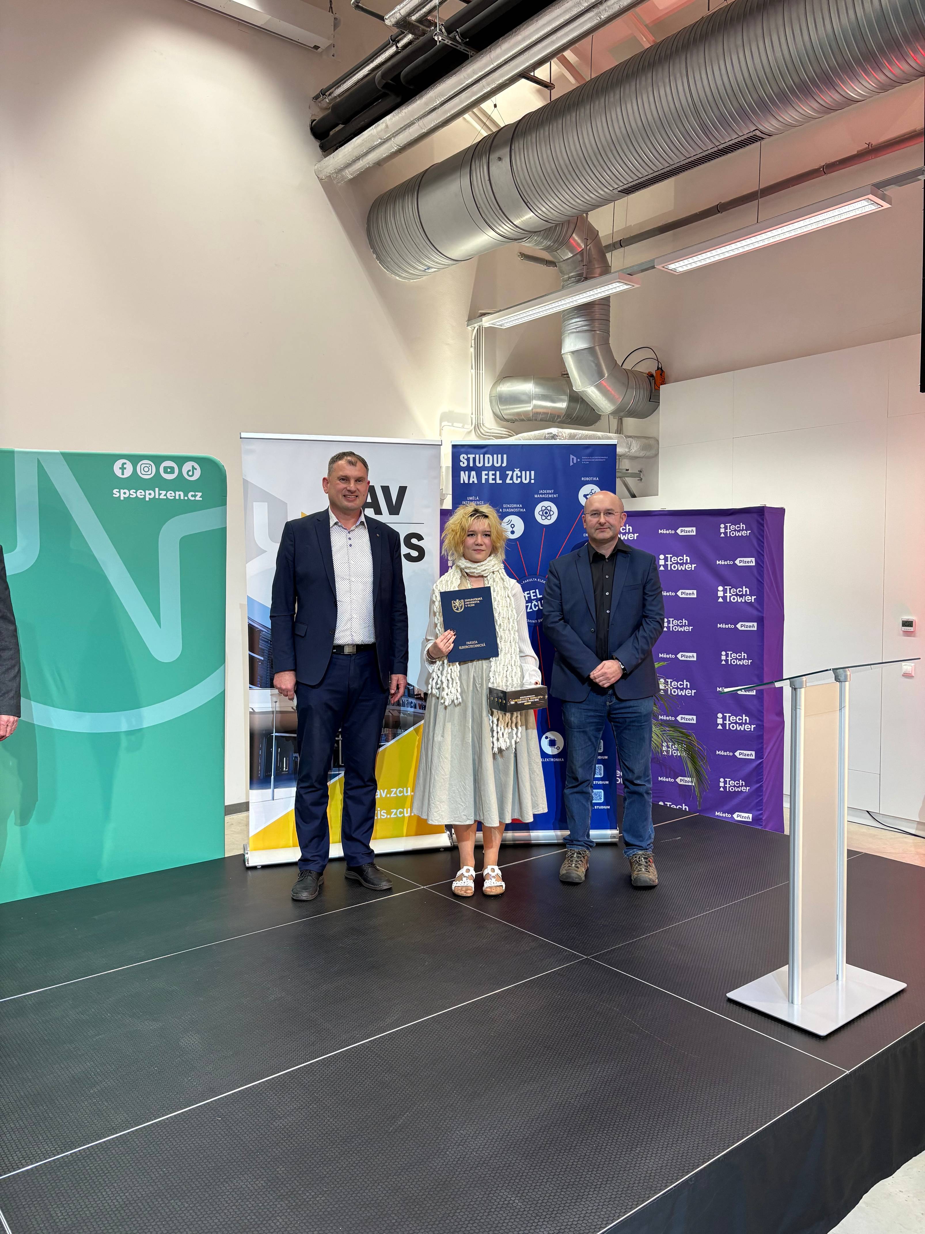 In addition to the general awards, UWB faculties served as expert judges, each presenting a Faculty Award to the project that best met their specific technical criteria. The Faculty of Applied Sciences (FAV) once again recognized Václav Šmejkal for his Encryption and Chat Library project, while the Faculty of Economics (FEK) honored Ivana Klymko and Bohdan Stefanyk for their next-generation fitness center project. The Faculty of Electrical Engineering (FEL) award went to Eliška Okrouhlá for her innovative sensory glove.